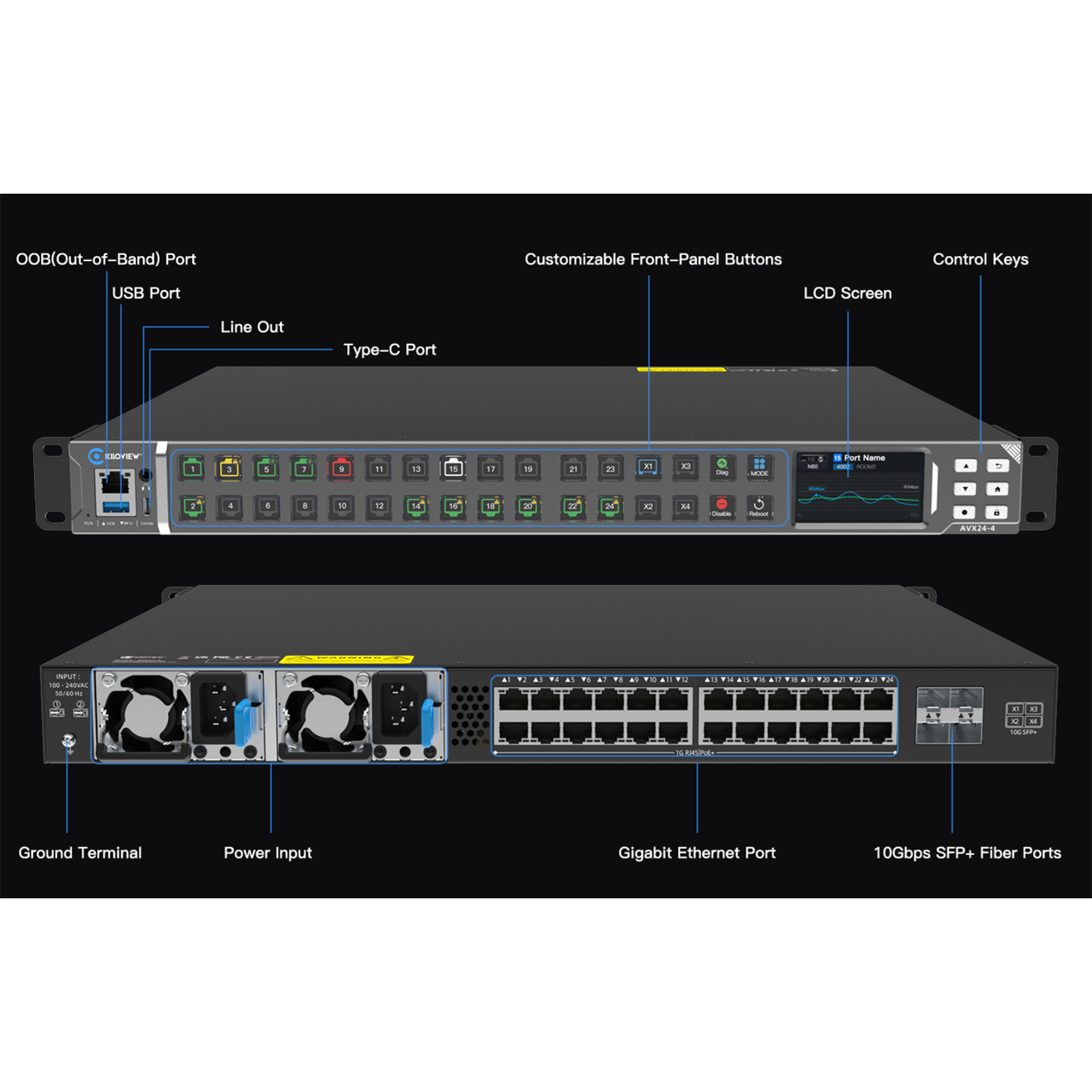 Built on a high-performance switching foundation, AVX24-4 Media HUB features 24 Gigabit PoE ports, four 10G SFP+ uplinks, and a total switching capacity of 226Gbps, pre-configured for AV workflows to ensure smooth, loss-free media delivery even in demanding, high-density scenarios.