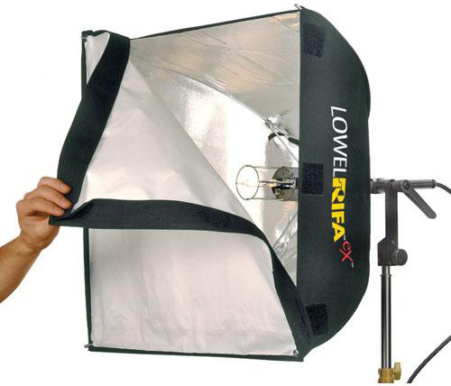 Rifa eX 44 is the smallest member of the Lowel Rifa family. Its 16" diffusion screen and 21" collapsed length make it ideal for compact kit run & gun lighting. Its abilities are enhanced further by the Rifa eXchange System accessory lampheads. Power it with AC from 105-300w, or switch cables & lamp it at 50 or 100w for DC operation. Swap to an accessory head to use our high color screw-in daylight fluorescent lamps. Ideal for lighting closeup interviews, small area tabletop shoots, webcasting & more. Creating beautiful soft key or fill light doesn't have to be strenuous or time consuming. Compact, lightweight, & self-contained, the Rifa eX uses a simple design approach as old as the umbrella to achieve its quick & easy setup and strike capabilities. Bathe almost anything, from talking heads to table-top stills, in luxurious almost fool-proof soft light. It is the perfect complement to today's compact, light-sensitive, digital cameras & film stocks. Its abilities are enhanced by the eXchange System accessory lampheads patented bayonet mount, which lets you swap lampheads with a twist of the wrist. Shooting in daylight? All Rifa eX model's can use our new high CRI daylight fluorescent lamps. Need less light? All 4 models can now go down to 125W AC. No AC current? All 4 can use DC battery power. 1 Minute Set-up Time Unlike common, inefficient soft boxes that must first be assembled and then attached to a light as an accessory, the Rifa is both light and soft box combined. Rifa eX can easily go from carry bag to stand, fully set up, in one minute or less.