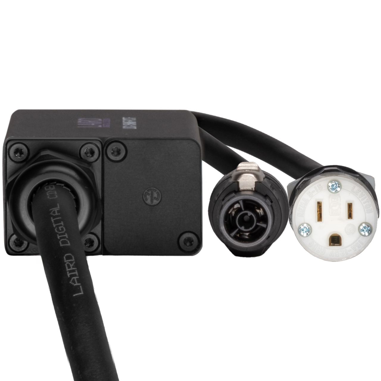 The Laird LDC-15NMF-PCTF is an Edison power distribution splitter that sends power via one 5-15 Edison Male plug to one NEMA 5-15 Female and one Neutrik powerCON TRUE1 Female connector.