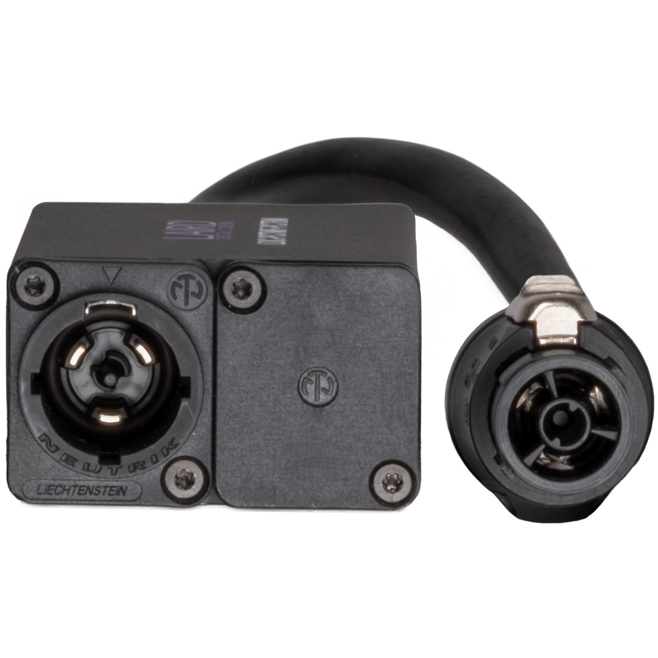 The Laird LDC-PCTMF-PCTBM is a powerCON TRUE1 power distribution splitter that sends power via a Neutrik powerCON TRUE1 Male connectors to one Neutrik powerCON TRUE1 Female and one powerCON Type B connector.