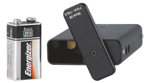 The receiver operates on a single 9 volt alkaline or lithium battery. Alkaline battery life is up to 8 hours. Lithium battery life is well over 20 hours. The LED indicator changes color from green, to yellow, to red as the battery voltage declines to provide plenty of warning before operation ceases.