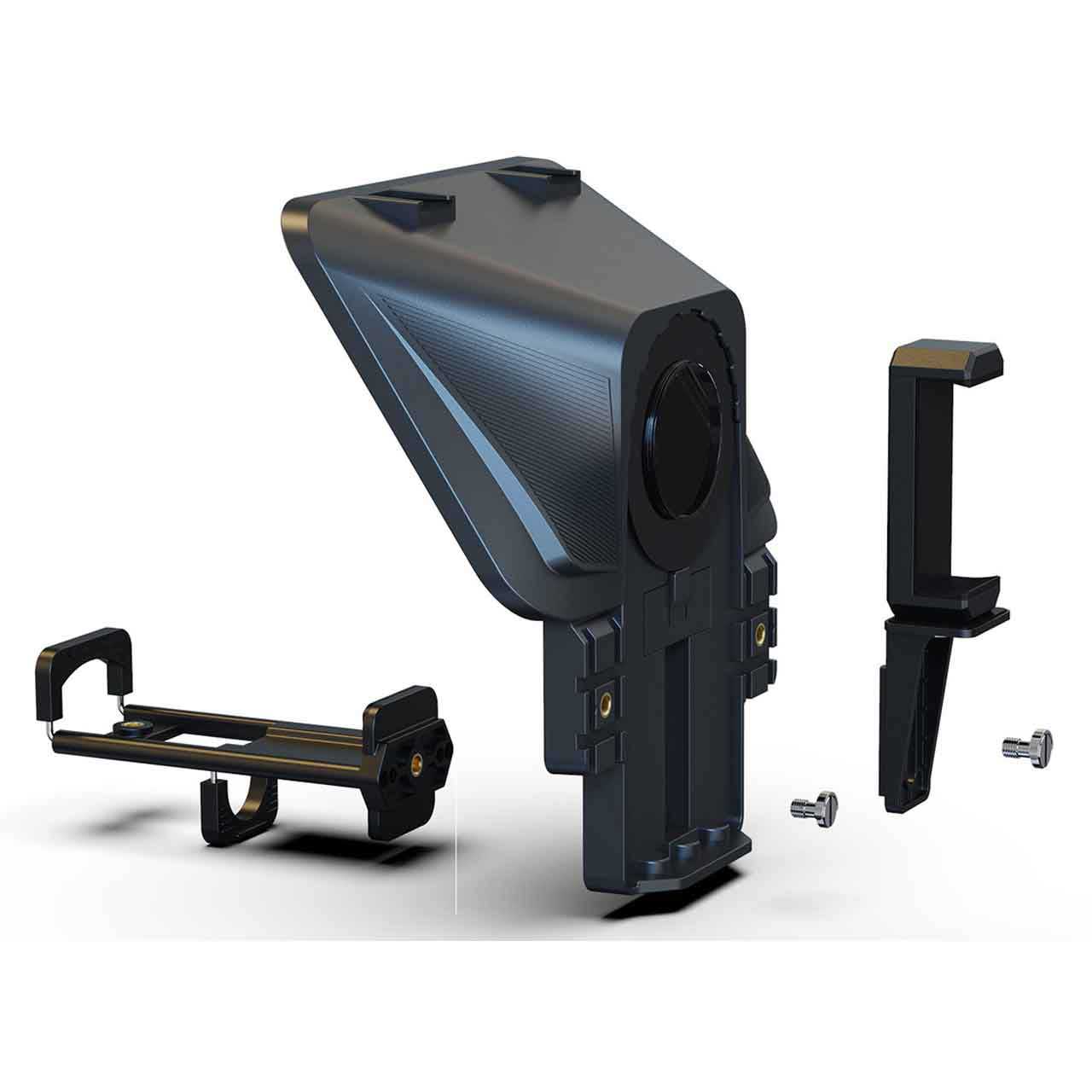 Dual cold shoe design allows for a variety of auxiliary equipment to bemounted on top of teleprompter.