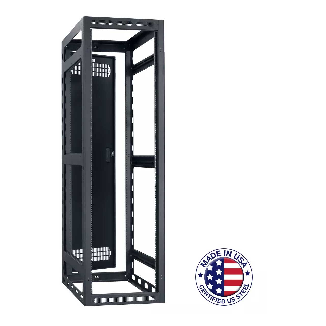 The Lowell LGR-4042 fully-welded open frame rack with seamless side-frame construction and 14-gauge steel base is reinforced at load-bearing junctions for robust support. The rack has a configurable top opening and ships with two panels that can be used to close the top or replaced with optional 19-inch fan panels for active cooling. The gangable rack features a 23-inch wide footprint and black textured powder epoxy finish. Available with or without a rear door. Optional front door and side panels (order separately). Configurable top, closure panels included.