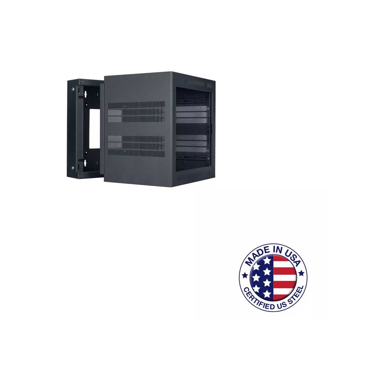 The Lowell LWR-1023 heavy-duty sectional wall rack features a front mounting section that swings open from its backbox, allowing easy access to cables and equipment. The welded 16-gauge certified U.S. steel rack features fully gusseted corners and a triple formed (side-to-bottom, side-to-top) wrap design that mounts to the backbox with positive-locking, spring-loaded L-pins. A roller closure keeps the front closed without mandatory locking. U.S. steel with black powder epoxy finish. Optional front door (order separately).