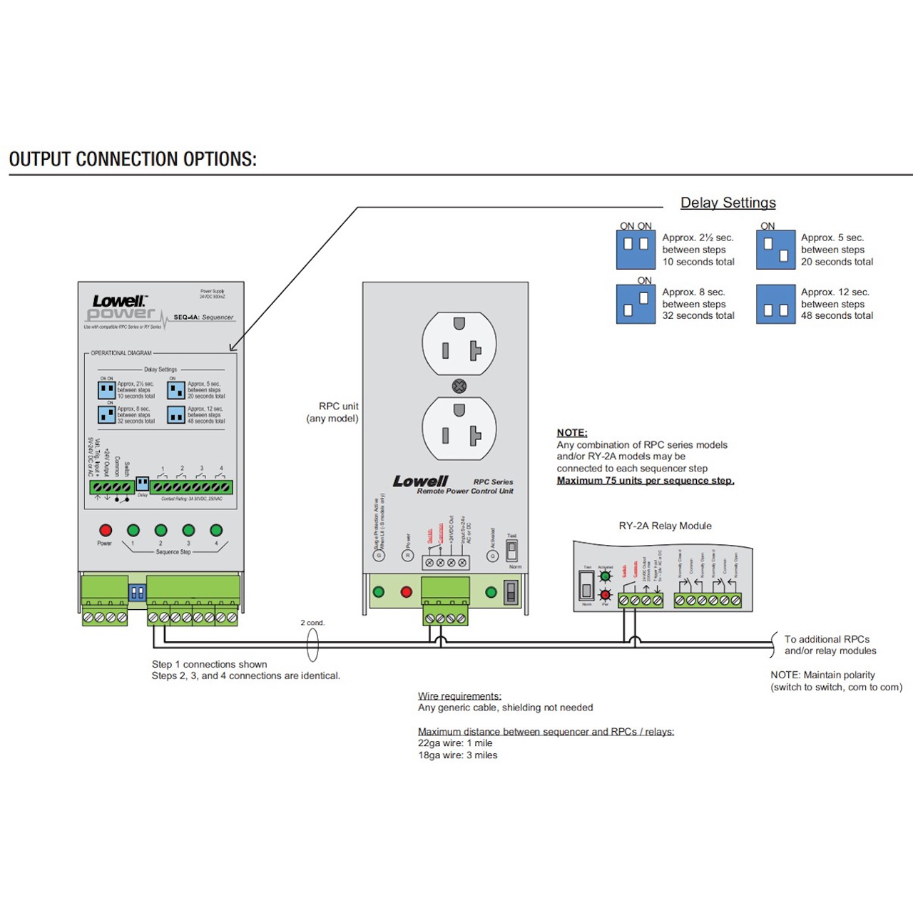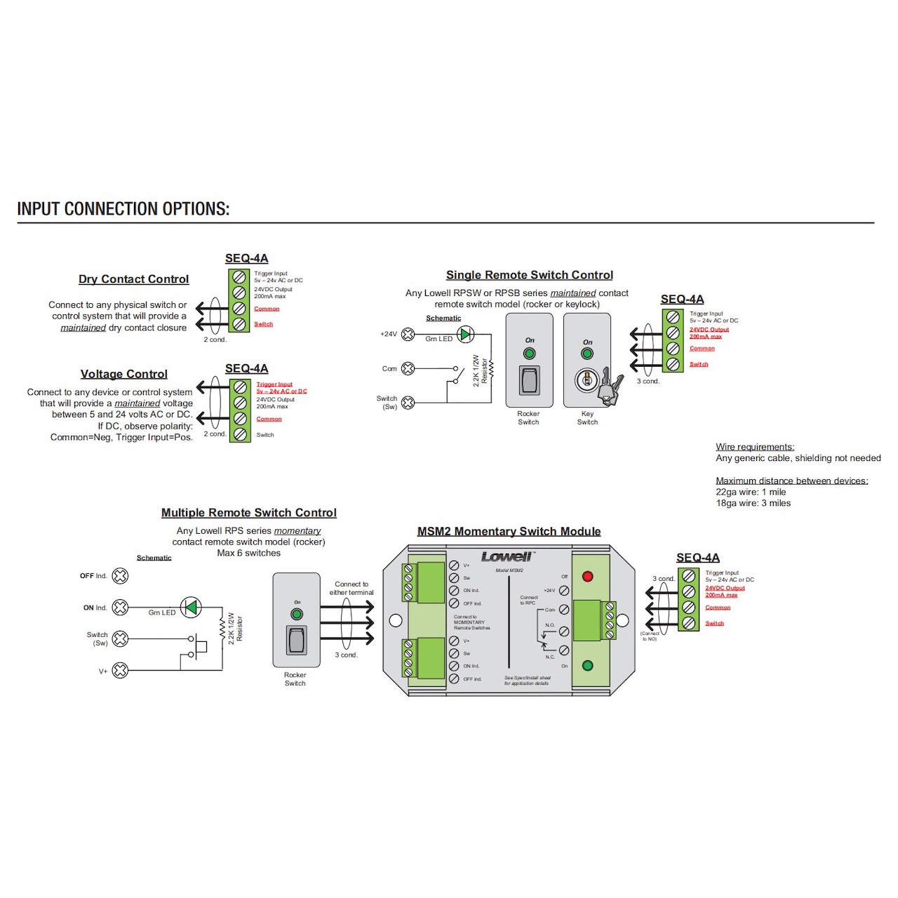 • For multi-switch applications, connect the sequencer to Lowell's MSM2 module, then connect the module to multiple remote SPST switches (RPS Series) with momentary contact closure