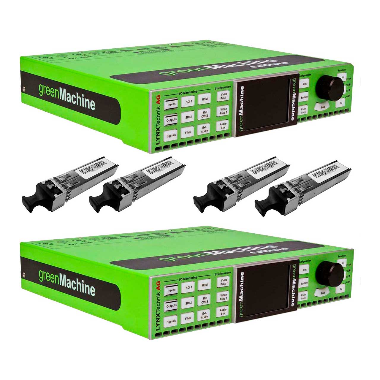 The LYNX Technik GMPT BIDI US Transport constellation is a cost-effective bidirectional transport solution that allows transportation of video, audio, Ethernet, and GPI efficiently across two greenMachine Titan hardware devices. It is a flexible solution for applications that require an exchange of multiple signals on two single fiber links over long distance. A Master/Slave model of communication is used between the two greenMachine Titan hardware devices where one machine will act as a Master device while the other will be a Slave.