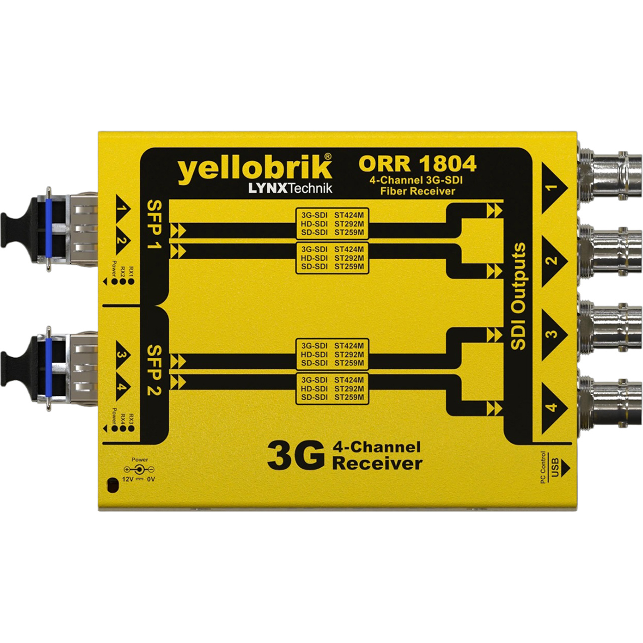 The LYNX Technik Yellobrik ORR 1804 is a compact 4-Channel Fiber to 3G-SDI receiver designed to overcome the limitations of distributing uncompressed, broadcast-quality video signals over long distances. When used with the RFR 1200 rack frame It fits within 2RU rack height and does not require additional cooling.