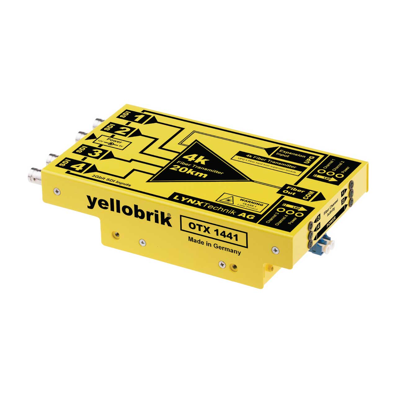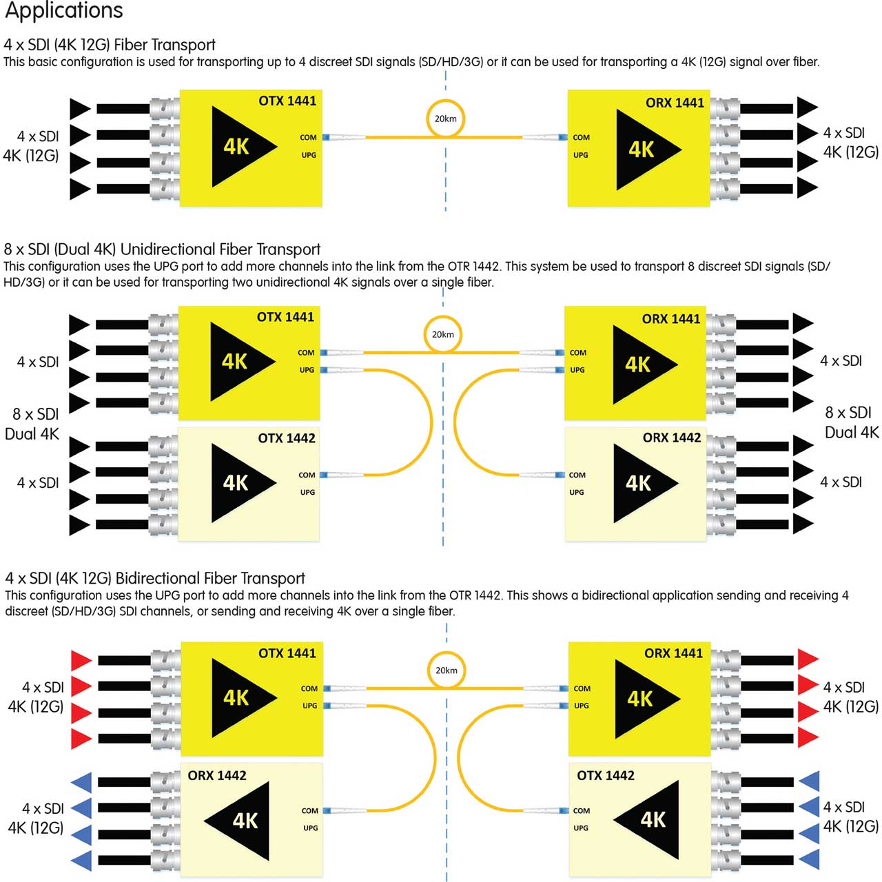The OTR 1441 is a self contained fiber transmission kit for the transport of 4 x SDI signals (12G uncompressed) over a single fiber link for distances up to 20km (12miles). The kit includes the fiber transmitter, fiber receiver and power supplies. This is an ideal solution for the transmission of multiple uncompressed SDI streams over long distances with zero losses.