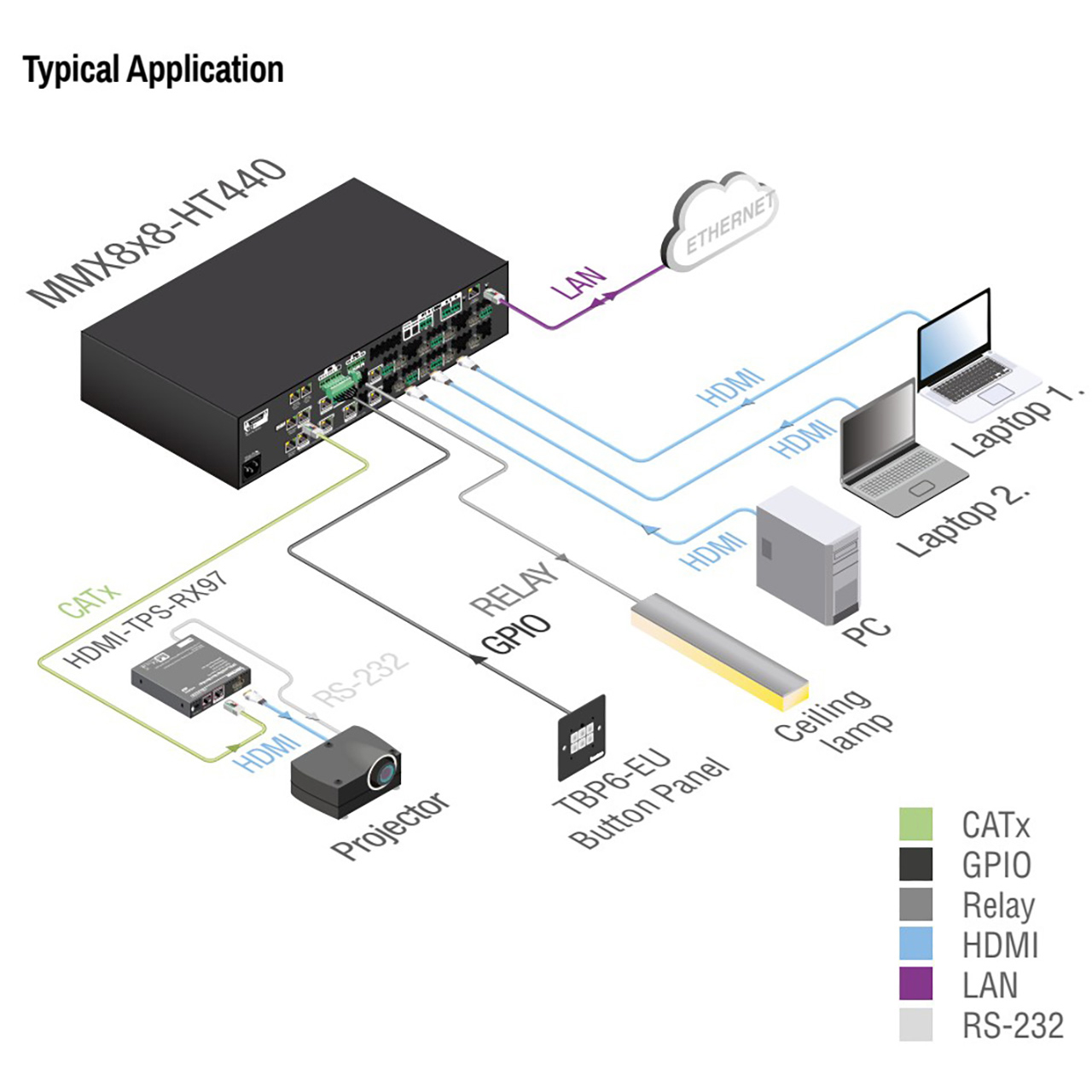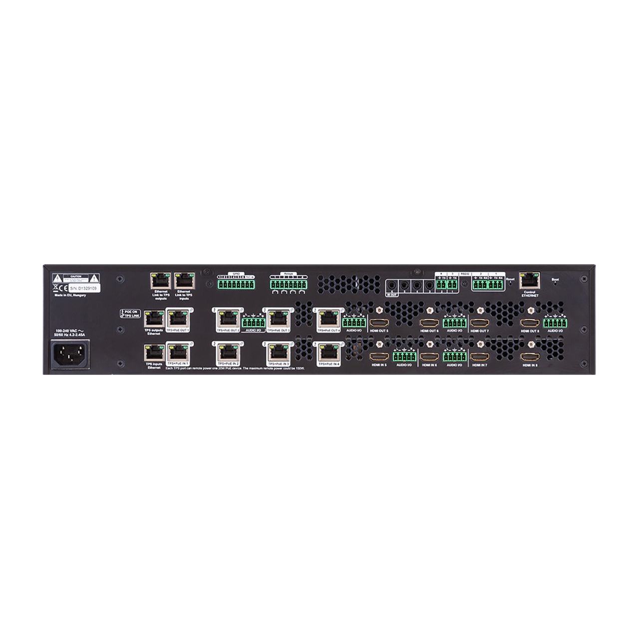 The Lightware MMX8x8-HT440 is a standalone matrix switcher specifically designed for conference room environments. It has four HDMI and four TPS2 (HDBaseTTM) inputs with four HDMI outputs and four TPS2 outputs. 4K/UHD (30Hz RGB 4:4:4, 60Hz YCbCr 4:2:0), 3D capabilities and HDCP are fully supported.The device also has eight balanced 5-pole Phoenix audio connectors at four of the TPS2 and HDMI inputs, four of the TPS2 and HDMI outputs.The audio signal direction of the port can be changed with the Lightware Device Controller software, so these audio ports can be either input or output ports.PoE 48V remote powering is available on every I/O TPS ports for cost-effective installations.