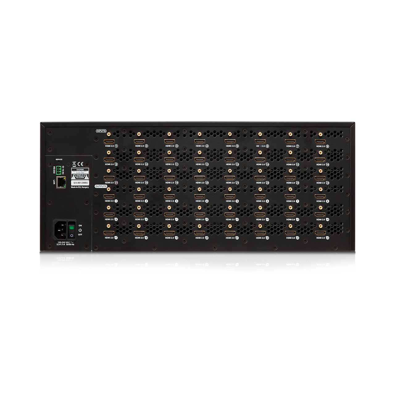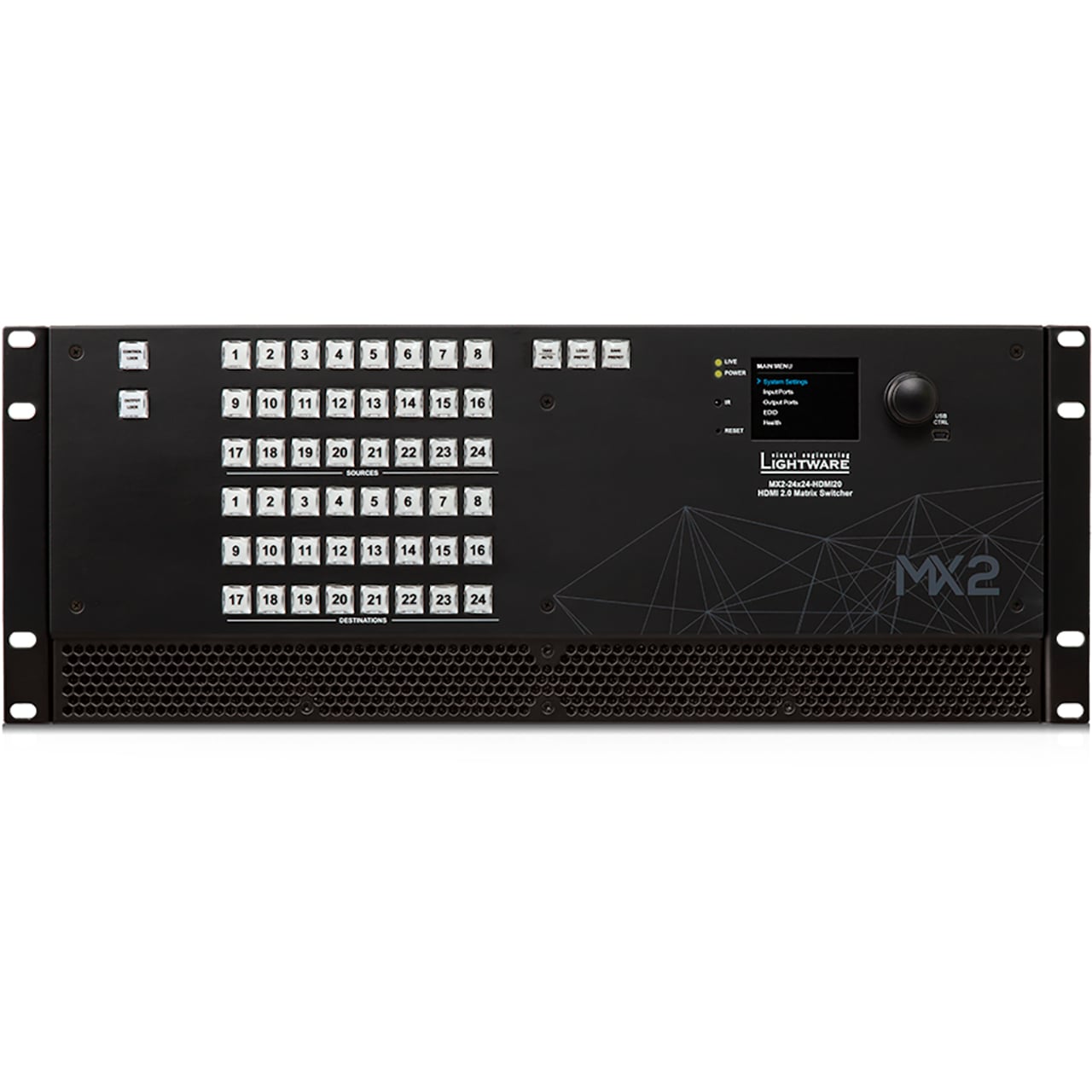 The Lightware MX2-24x24-HDMI20 is an HDMI 2.0 standalone matrix switcher that supports uncompromised 4K UHD resolution at 60Hz 4:4:4, and allows de-embedding audio from, and embedding audio to the HDMI stream. It has an outstanding port density that makes it particularly suitable for rental and fix install applications, as well as for future-proof operation centers. It is a perfect choice for installations where HDMI 2.0 compliant input and output ports are required. This flagship product has 24 HDMI 2.0 inputs and 24 HDMI 2.0 outputs transmitting up to 4K at 60Hz in 4:4:4 format, while supporting 3D, Dolby TrueHD, and DTS-HD Master Audio.