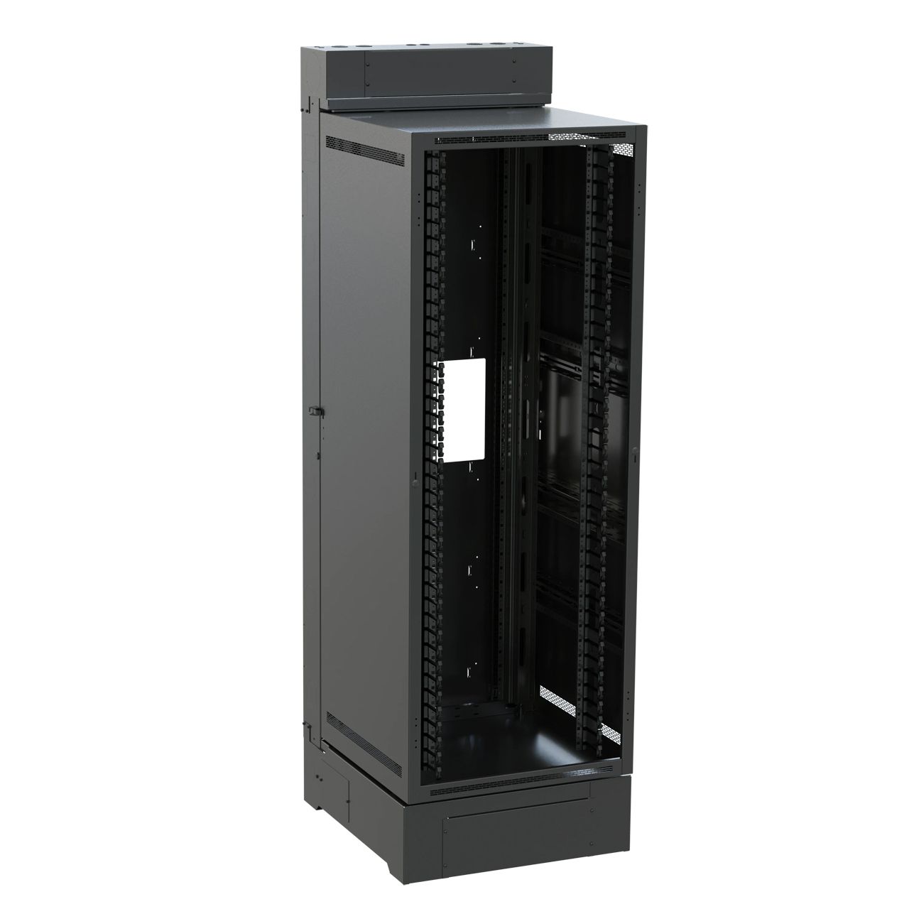 The innovative design of the Middle Atlantic SR28-40-32 allows the rack to pivot open 90° on a floor base to provide quick and convenient access to rear equipment connections eliminating the need for an aisle behind the rack. Specify an SR Series enclosure when space savings is required for heavier installations that will connect to on-wall cabling or pull boxes, and when easy access to rear equipment connections is essential.