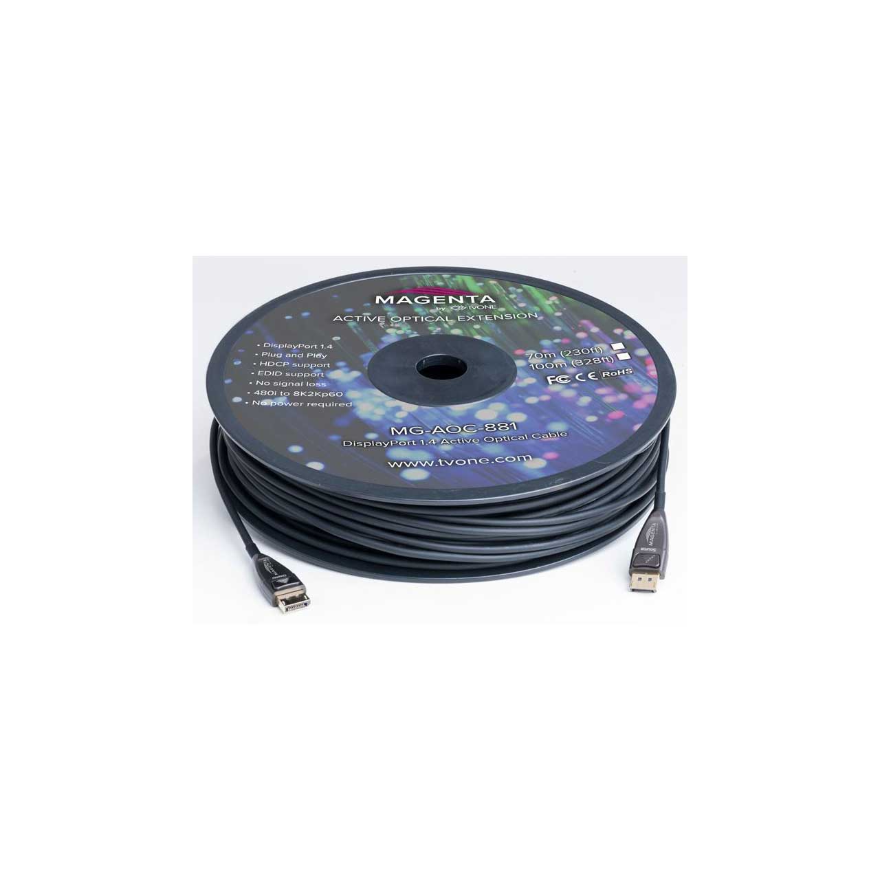 The Magenta AOC-881 active optical cable provides a simple yet powerful solution for extending high resolution over long distances. This plug and play DisplayPort 1.4 cable supports up to 8K60 4:4:4 with no compression, signal loss or latency up to 328 feet (100 meters) and without the need for external power. The MG-AOC-881 features HDCP and EDID support.
