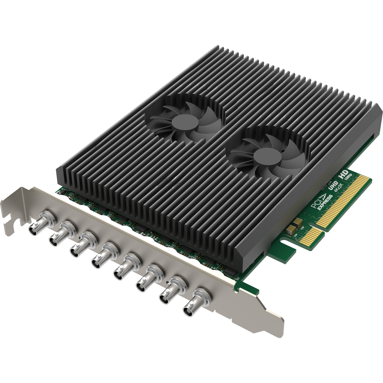Multiple of these low-profile cards can be plugged into a single host, with an on-board rotary switch allowing you to set the card number. Video engine features include 10-bit video processing, deinterlacing, cropping, color adjustment, hardware timestamp, color space conversion, up/down conversion, aspect ratio conversion, OSD, and SG-DMA transmission mode. The card can be run continuously for 24 hours a day, seven days a week.