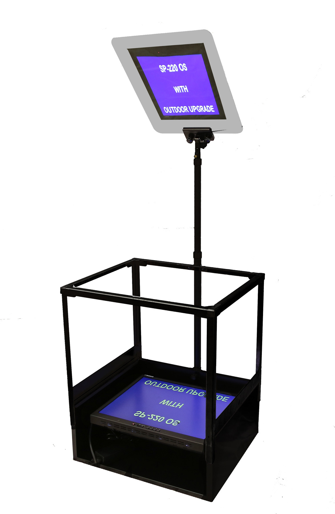 The largest speech prompter on the market. Features two 19" LCD color panels. 1000 NTS make them extremely bright! These panels work anywhere in the world. They accept SDI, composite video of NTSC/PAL, and extremely sharp SVGA & HDMI signals direct from your computer. These monitors can reverse the image left to right from within. Universal power 110/220 volts AC or 12 volts DC. Includes two housings, poles and mirrors. Mirror size: 12.75" x 15.5". The SP-220 includes new adjustable glass holders for ease of operation. As top-of-the-line as you can get.