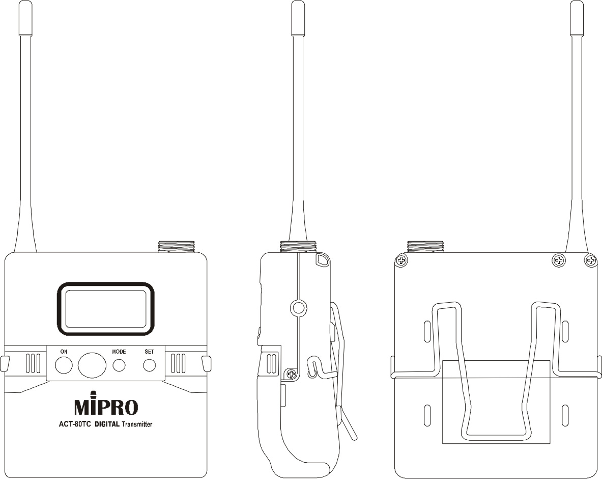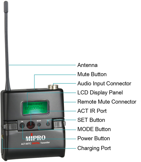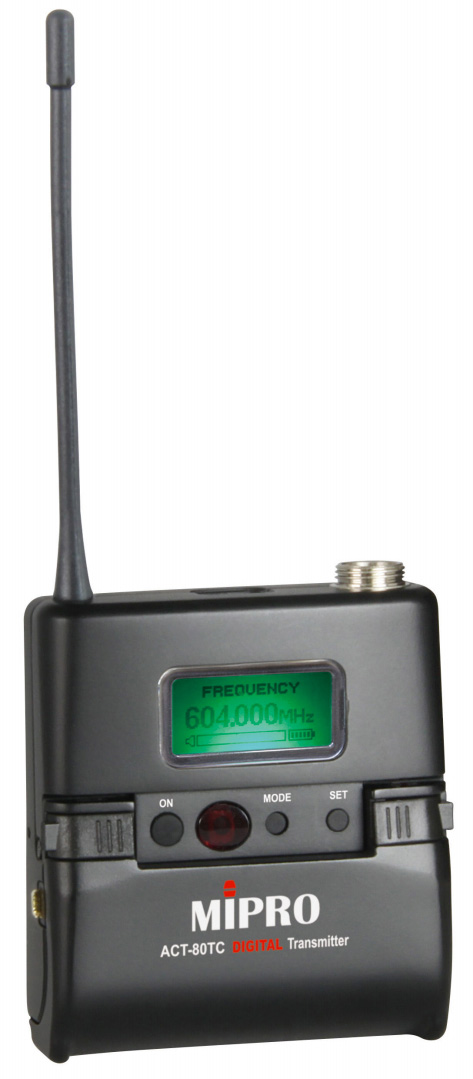 The MIPRO ACT-80TC rechargeable bodypack transmitter is for use with the ACT-818 and ACT-828 receivers. It features a durable magnesium alloy housing and is the industry's smallest digital bodypack transmitter. It has a detachable antenna and direct and remote mute control. The MIPRO ACT-80TC has an adjustable beltclip and is powered by one 18500 lithium rechargeable battery.
