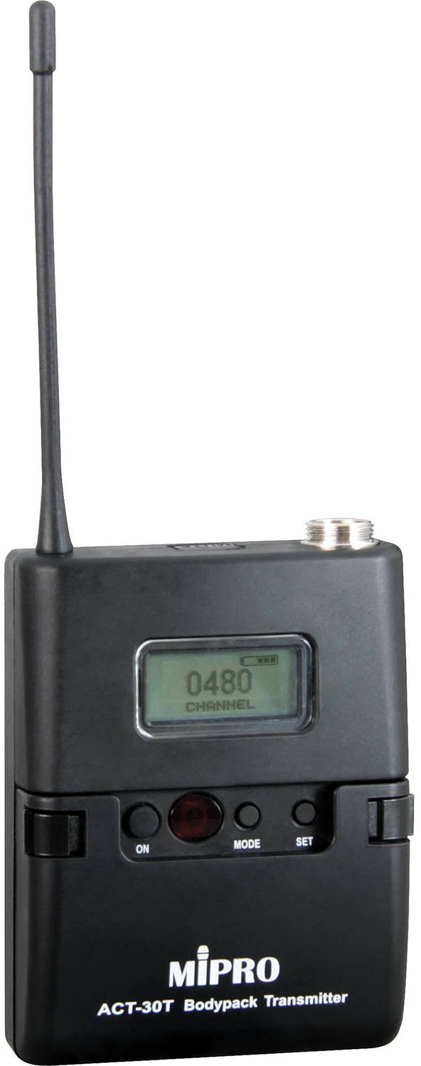 The MIPRO ACT-30T handheld transmitter packs top-shelf electronics into a rugged, compact unit packed with useful features such as a backlit LCD display a top-mounted mute switch. The ACT-30T is amazingly easy to use. One-touch ACT syncs your transmitter and receiver frequency automatically, so all you have to do is power on. The unique battery cover design gives you easy access to controls, while protecting your settings. If you've got a MIPRO PA system, get the handheld transmitter that's made for it - the MIPRO ACT-30T.