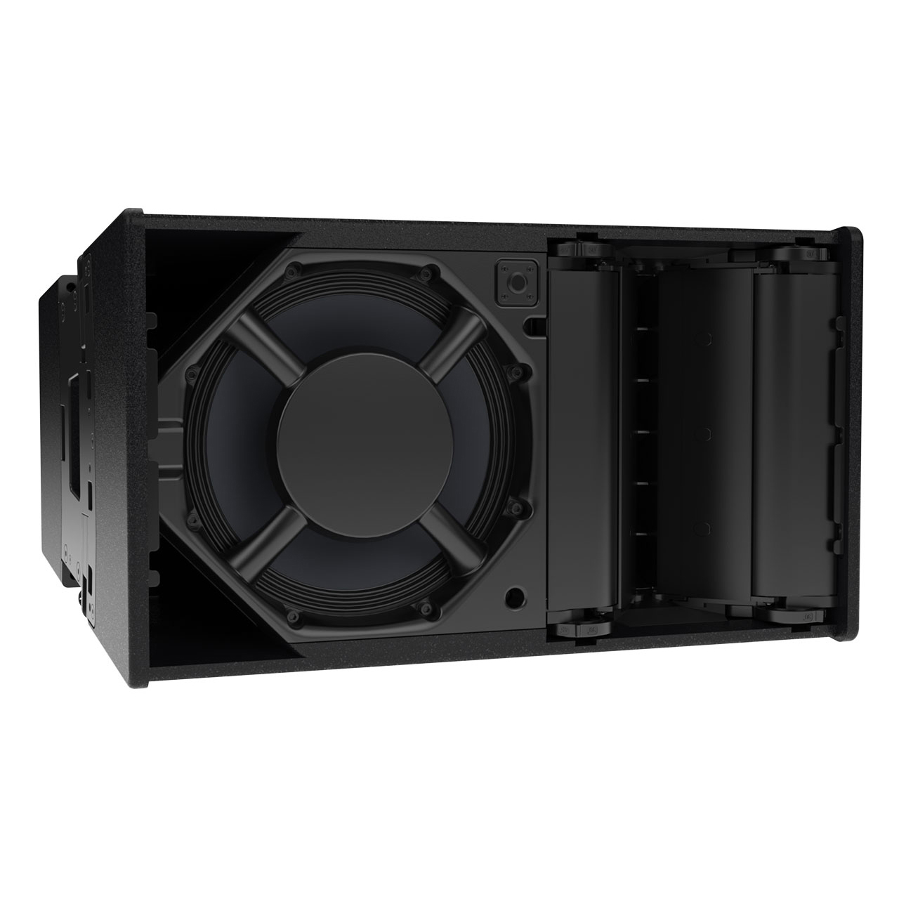 Its durable plywood is enclosure finished in hardwearing textured PU paint and incorporates two pocket handles for easy installation and deployment, as well as fixings for pole-mounting. The integrated rigging is suitable for install and touring applications and support horizontal array configurations of up to 180° with a flying frame that can support up to 6 cabinets in vertical orientation.