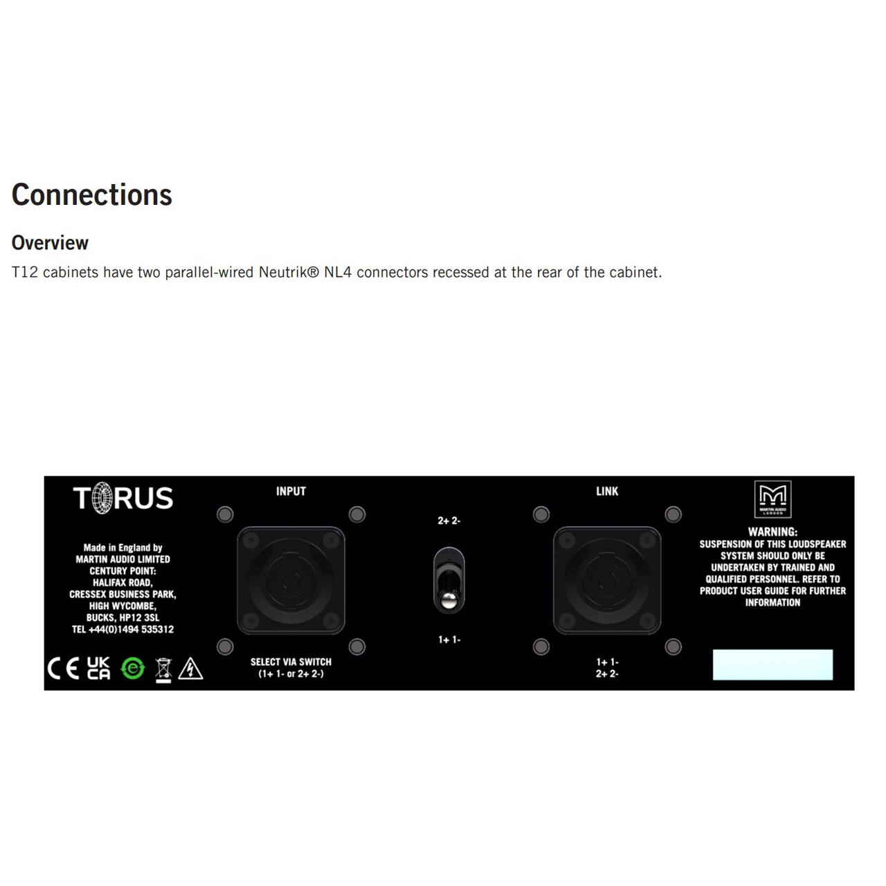 T1230 feature two NL4 connectors with passive configuration using pins 1+ 1- or 2+ 2- selected via rear-mounted switch. Systems are powered by Martin Audio iKON amplifiers, which support which support VU-NET control software and Danter integration. T1230 also feature a LED indicator that can be illuminated via VU-NET software to identify its location on the network. TORUS systems can be modelled in 3D with optimising filters to deliver consistent and defined coverage.