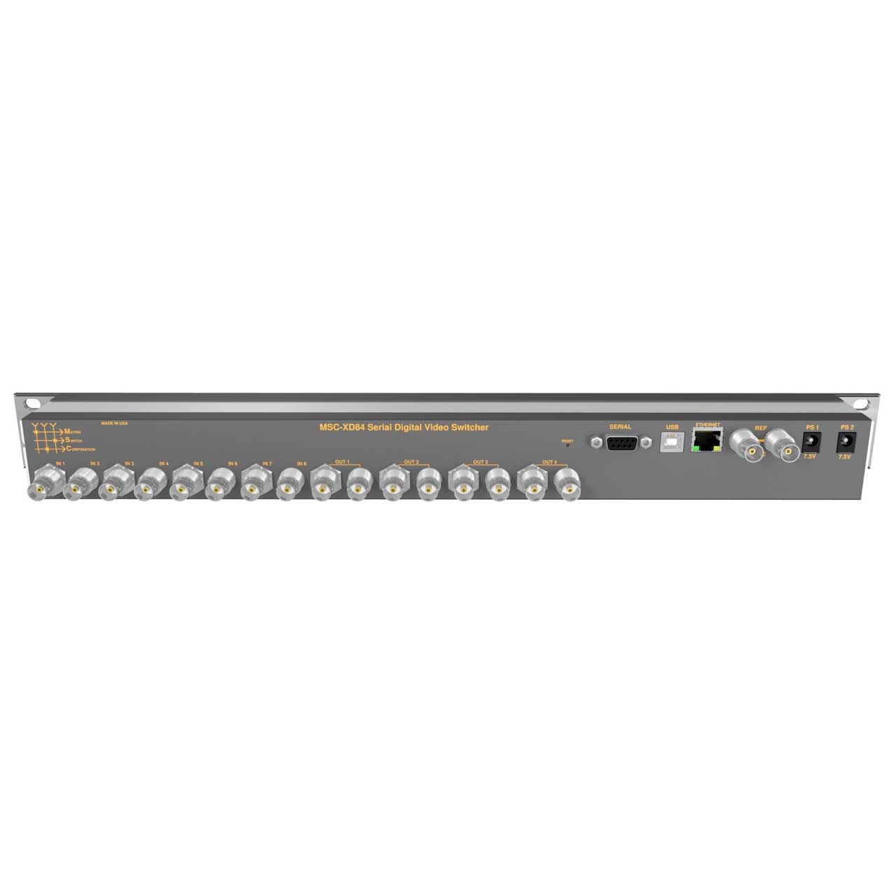 The MSC-XD84S SDI routing switcher has 8 inputs and 4 outputs. All Matrix Switch Corporation SDI routers provide reclocking for standard 3G/HD/SD rates with automatic bypass for non-standard rates between 20 Mbit/s and 3 Gbit/s and pass all SDI embedded audio/ancillary data. In addition the MSC-XD84S supports output mute. Switch on vertical sync is provided with the sync reference input with a pass-through connector and provides support for Tri-level sync and NTSC/PAL black burst signals.