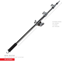 The accompanying Mini Matthboom is the solution for easy light fixture and strobe adjustment. Built of steel to remain rigid, even loaded with accessories, it can mount on a 5/8" Baby Pin and telescopes from 45"/115cm to over 80" 203cm at full extension, terminating in a 5/8" pin. Steel reinforced threaded collars ensure a solid bite from t-handles while set-screws and V-shaped brass brakes enable durable 3-point contact. A rear hook is ready to grab a sandbag for balancing while the knurled baby pin ensures safe mounting.