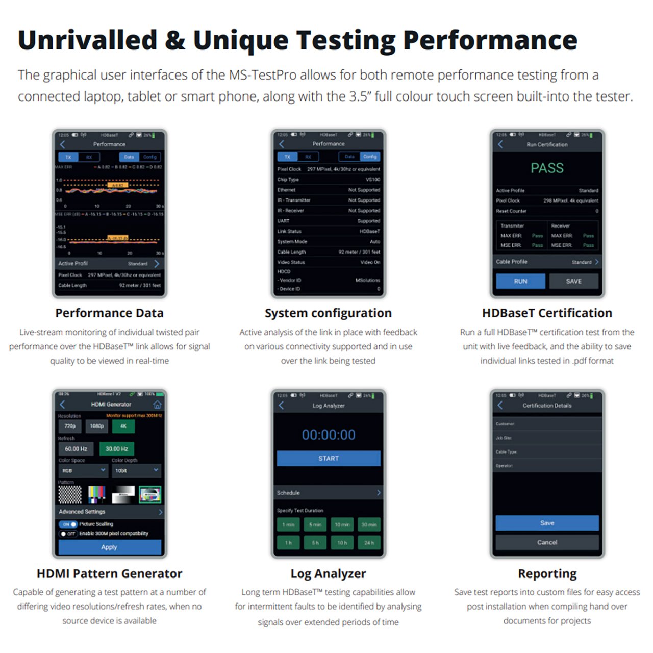 The MSolutions MS-TestPro MS-104B is the only HDBaseT tester that is all-inclusive, 100% reliable, portable and affordable, making it an indispensable tool for AV installers and integrators. It provides AV professionals with all the information needed while in the field to enable them to verify the integrity and stability of every system tested down to the last detail. Moreover, the MS-TestPro generates a report including all the parameters necessary to certify link quality and status for signals up to 4K Ultra High Definition. The report can then be transferred to a computer, tablet or smartphone for use by both installer and end-user.
