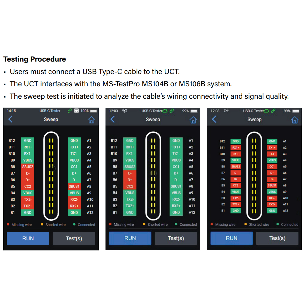 The MSolutions UCT USB cable test module allows for integrators to gain a deeper understanding of their USB connectivity through qualificaion of the cabling used within installations. The tester allows for the DC measurement of the internal wiring. Determine the USB-C features, USB2.0 (480Mbps), USB3.1 (Gen1 up to 5Gbps), USB3.1 (Gen2 up to 10Gbps), charging, monitor/laptop power, audio support, video and quality.