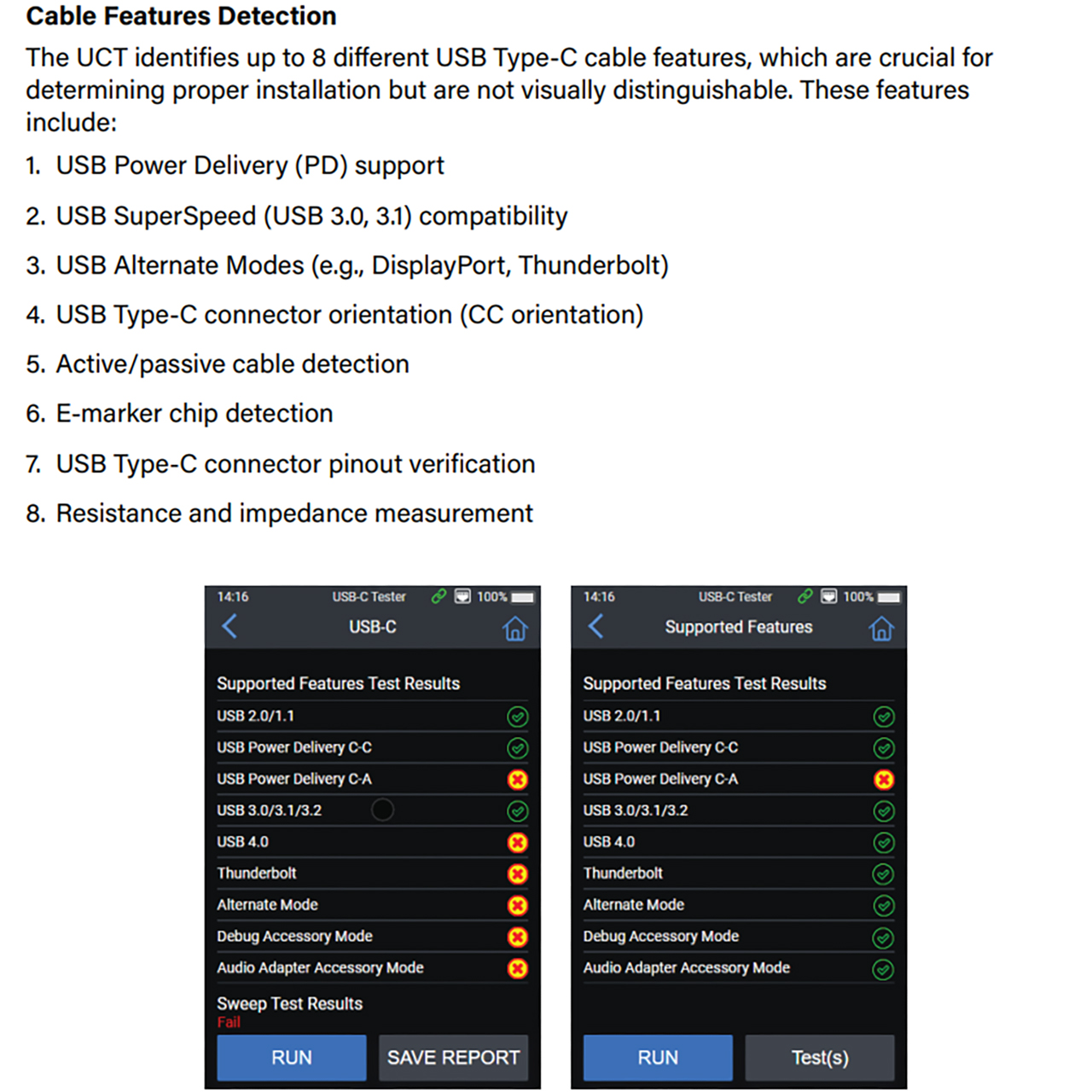The tester will identify and qualify the USB version that the cable has been manufactured to (i.e. 1.0, 1.1, 2.0, 3.0, DP, ETH).