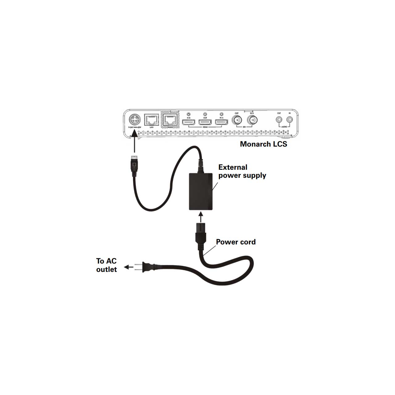 Power the Monarch LCS device using an AC outlet via the Matrox PWRSUPMHXL external power supply and a power cord.