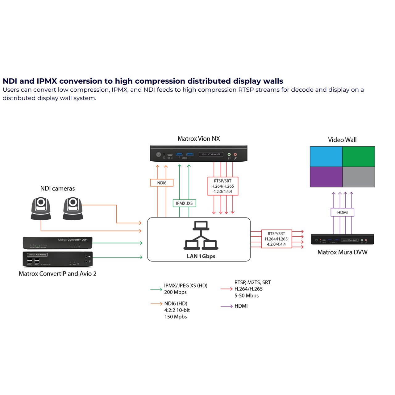 Users can convert their baseband SDI and HDMI signals to 4:2:2 10-bit NDI (full) streams that can then be fed to their NDI vision mixer. The NDI program output of the vision mixer can also be sent to Matrox Vion EX for encoding to a high-compression, web-friendly format like SRT.