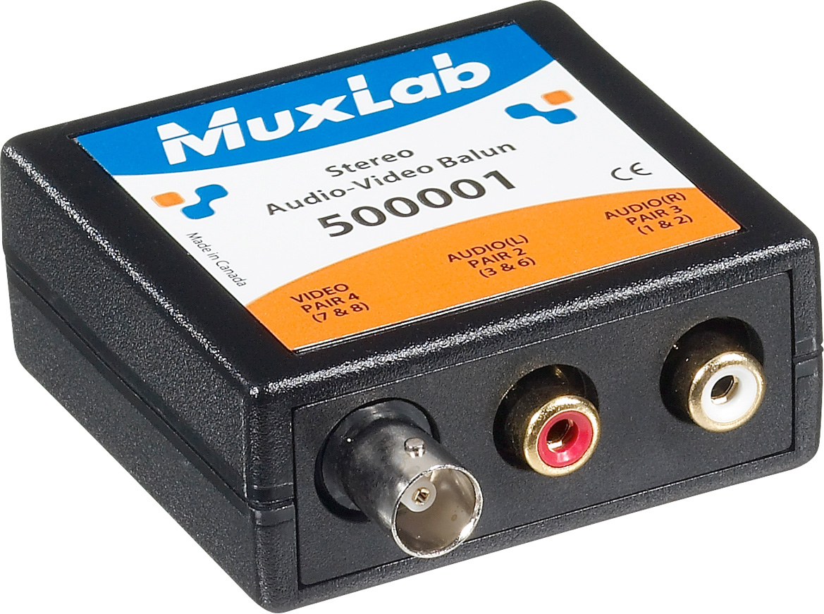 The VideoEase Stereo-Audio Video Balun allows a single (1) composite analog video channel and two (2) baseband analog audio channels to be transmitted via three (3) unshielded twisted pairs. Used in pairs, the Stereo AV Balun is used in home or commercial applications as a smart, fast and cost-effective means of cabling audio-video equipment using twisted pair instead of coax cable. The Stereo AV Balun may also be used in conjunction with MuxLab's CCTV-Audio/Video Hub (200200) for distribution to multiple monitors. Ideal for schools, home and business audio-video systems.