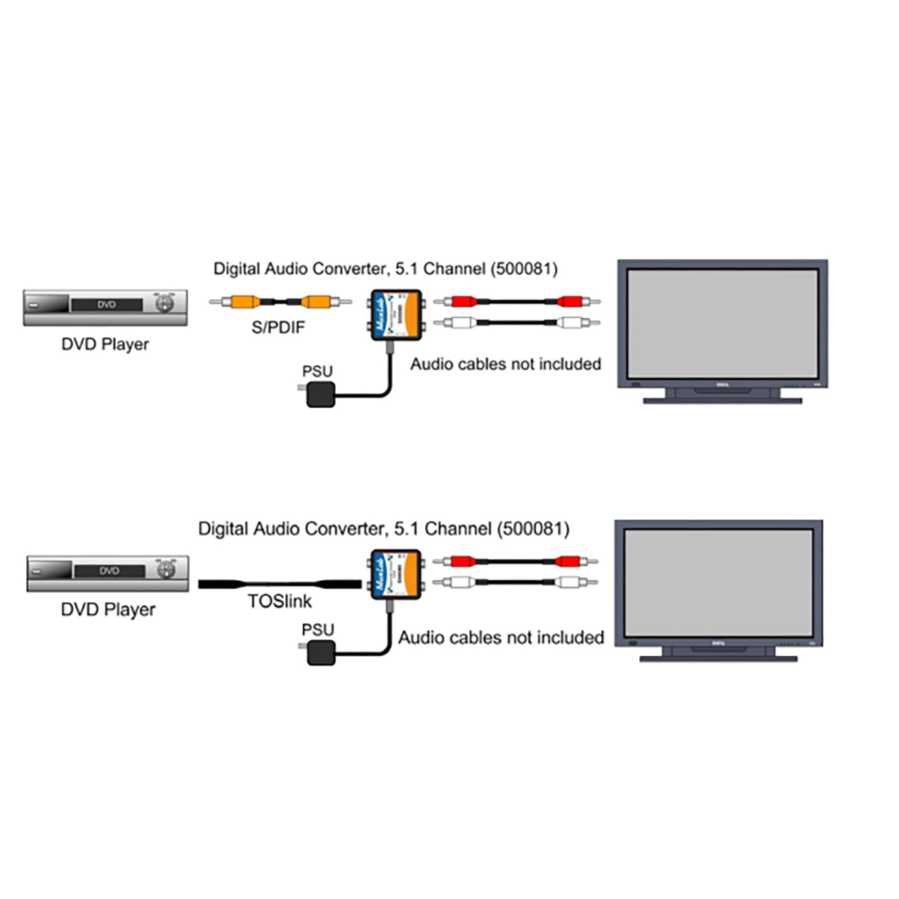 The Muxlab 500081 Digital Audio Converter for DolbyDigital converts one Dolby Digital encoded coaxial (S/PDIF) or optical (TOSLink) digital audio signal to a standard left/right analog audio output, thereby allowing a digital audio source such as a DVD or CD player without RCA analog audio output to be connected to an audio-video receiver or TV.