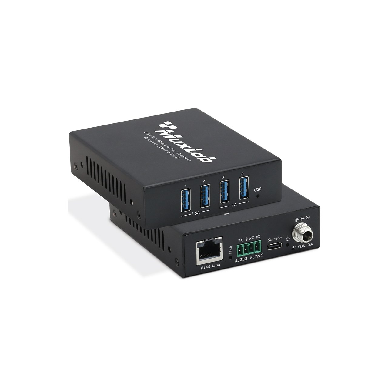 The MuxLab 500530 USB 3.2 Gen1 4-Port Extender Kit enables USB 3.2 Gen1 connectivity at data rates up to 5Gbps & extends true USB up to 328ft (100m) over standard Cat6a UTP. Transmitter features with one USB 3.2 Gen1 Type B input, one FSYSNC GPIO input and one RS-232 pass-through. Receiver features with four USB 3.2 Gen1 Type A outputs, one FSYSNC GPIO output and one RS-232 pass-through. The device also supports 24V Bi-directional PoC.