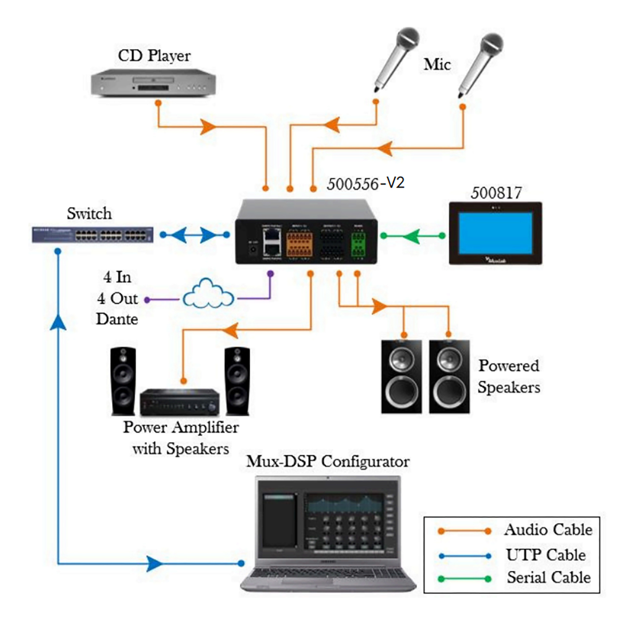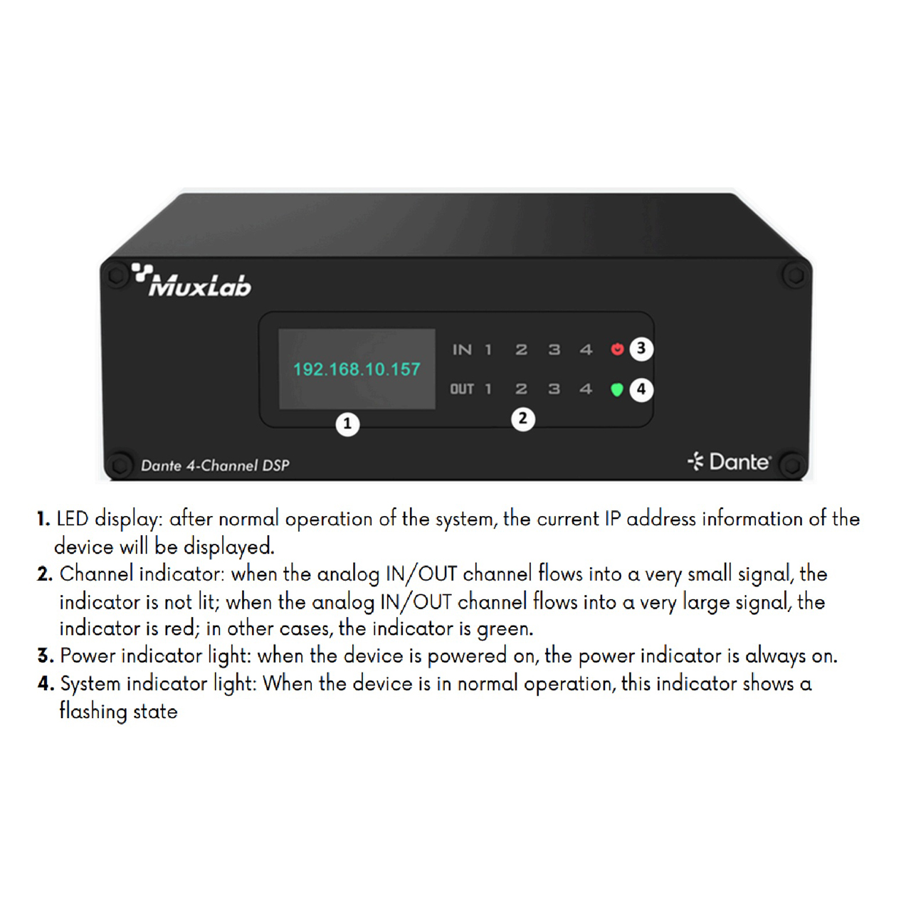 The MuxLab 500556-V2 Dante 4-Channel Audio DSP is product developed for the transmission, routing, and processing of audio signals in Dante networks. It can perform high-quality, low-delay audio transmission, supports 4-way input and output balanced analog channels, and can be powered via PoE from any PoE network switch or via a 12V DC power supply. This processor supports 4-way analog audio signal balance input and output, 4-way Dante digital audio signal input, and the 4-way Dante digital audio signal output. It also features a USB audio card that supports one channel of audio input and one channel of audio output. The device has one of the best DSP algorithms in the industry that includes options such as AEC, AFC, ANC, Ducker, Compressor, Limiter, Mixer and Graphic Equalization among others; In addition, the product provides PC version control software to monitor and operate all the functions on the DSP in an easy and intuitive way.