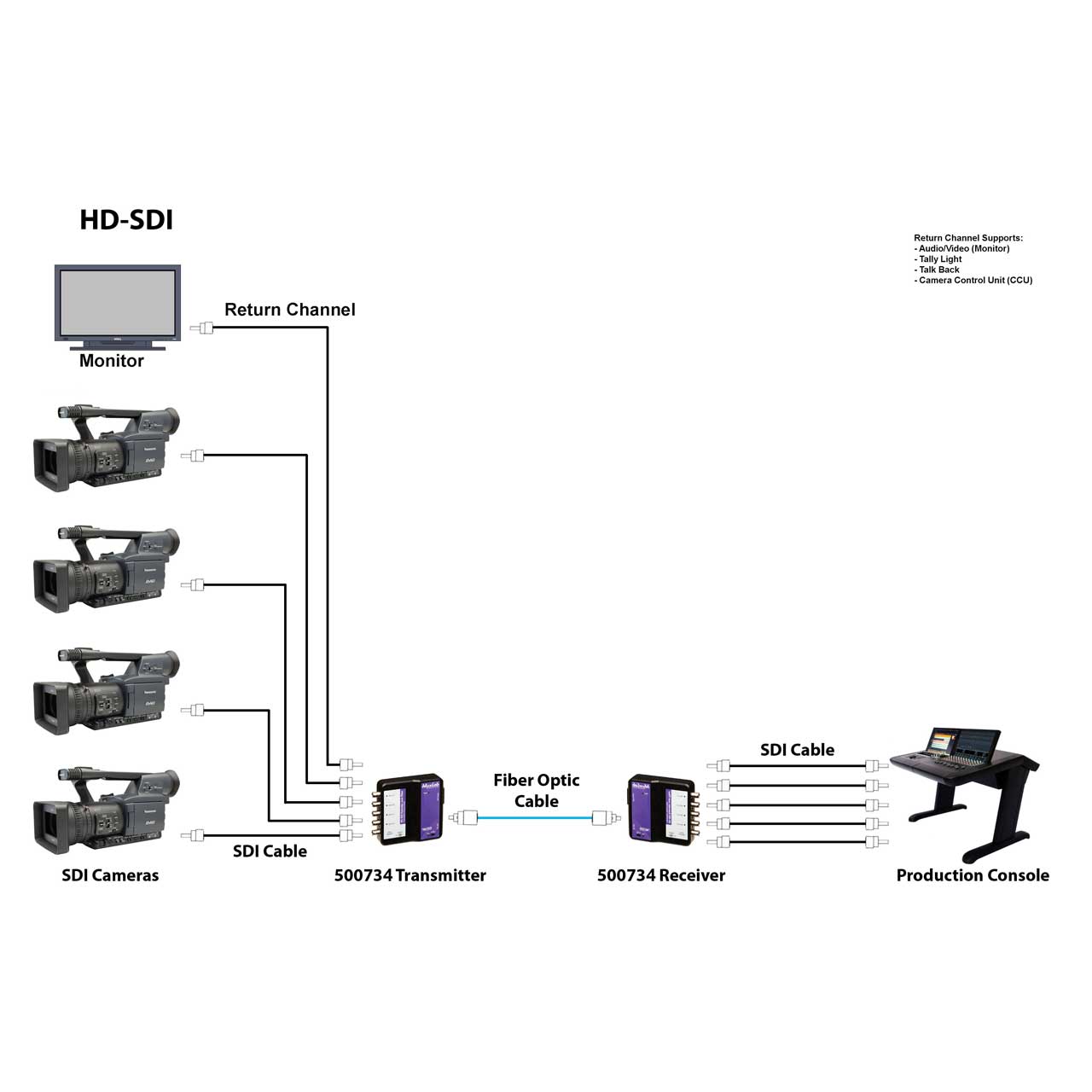 • Supports RS232 pass-through for remote control and as a return channel for tally light and camera control unit (CCU)