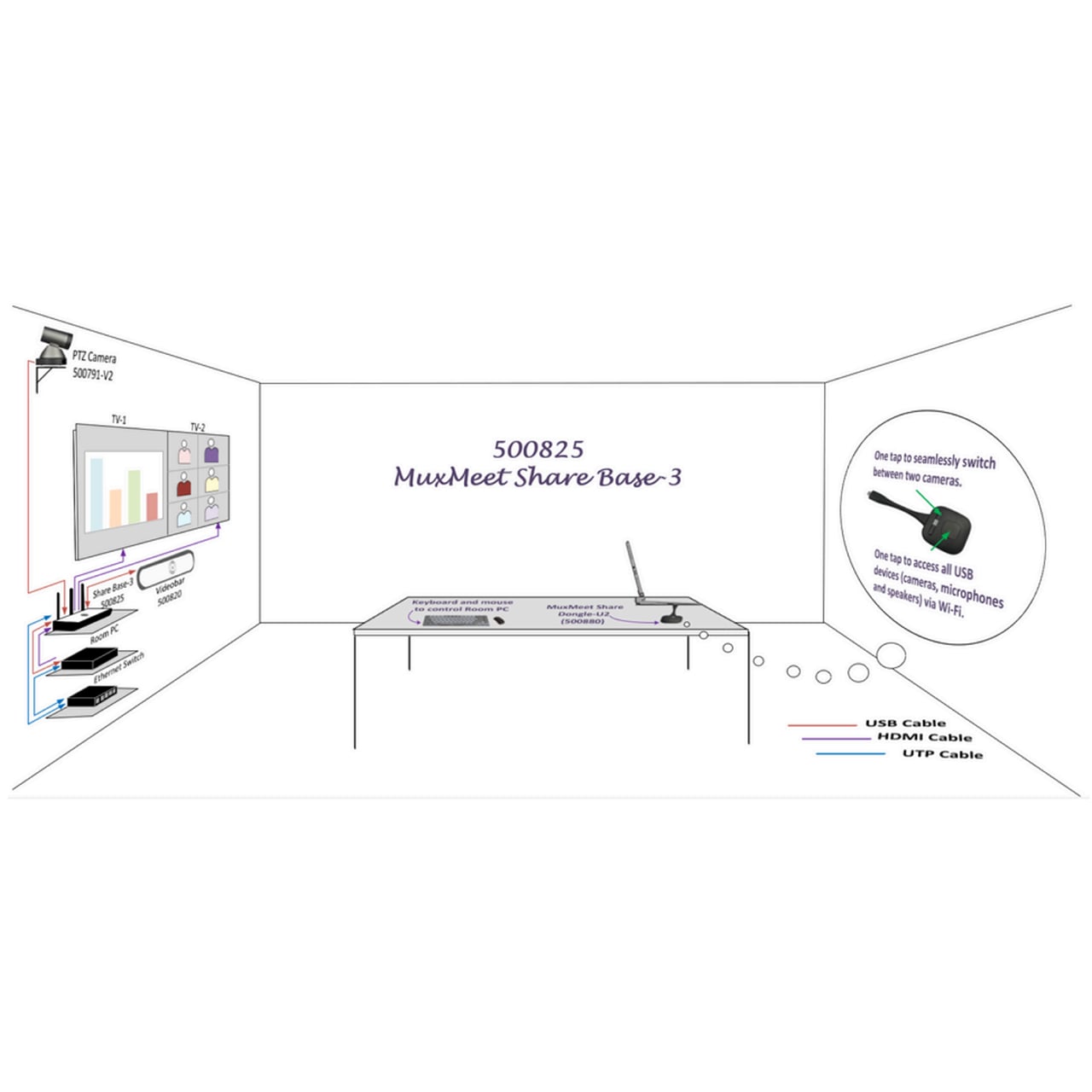 The MuxLab 500825 MuxMeet Share Base-3 is a wireless conference room product designed to meet the requirements of today's hybrid workforce, supporting not only local presentations but also allowing users to collaborate with remote participants. It enables people to connect the room camera, mic, speaker (such as the MuxMeet Videobar, sold separately), and display with their own laptops wirelessly, so people can take advantage of the room A/V system to collaborate with both in-room and remote meeting participants, without cable limitation and hassle.