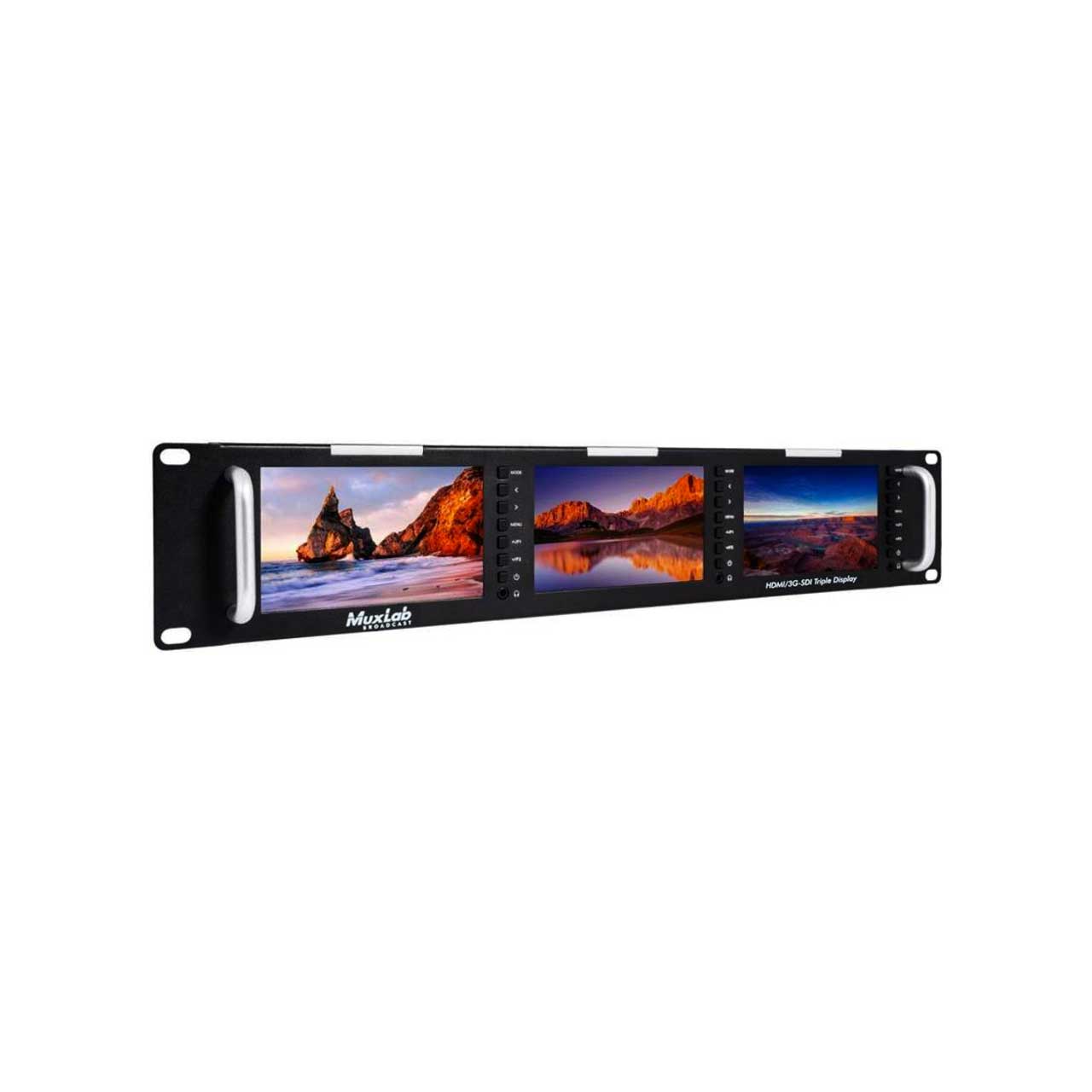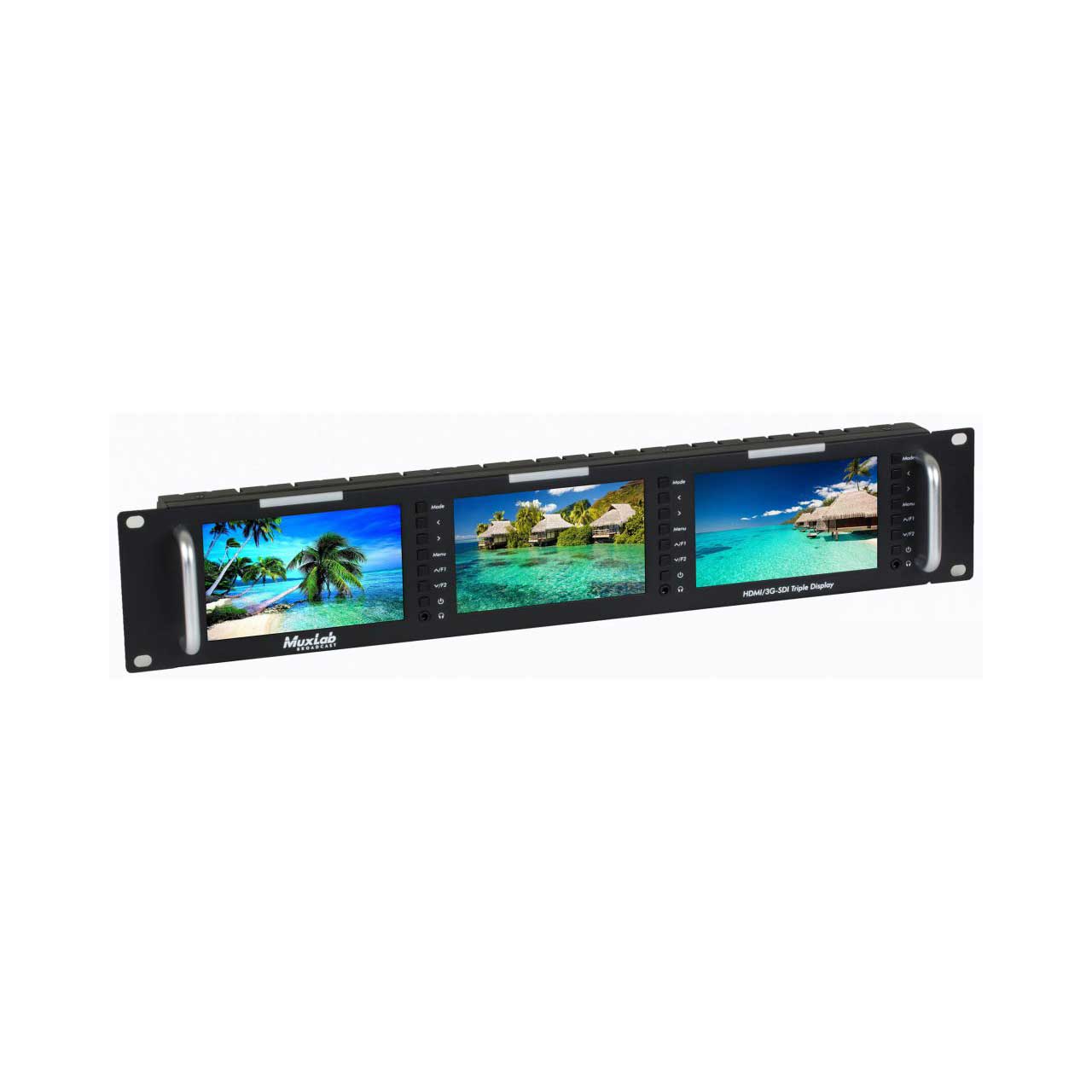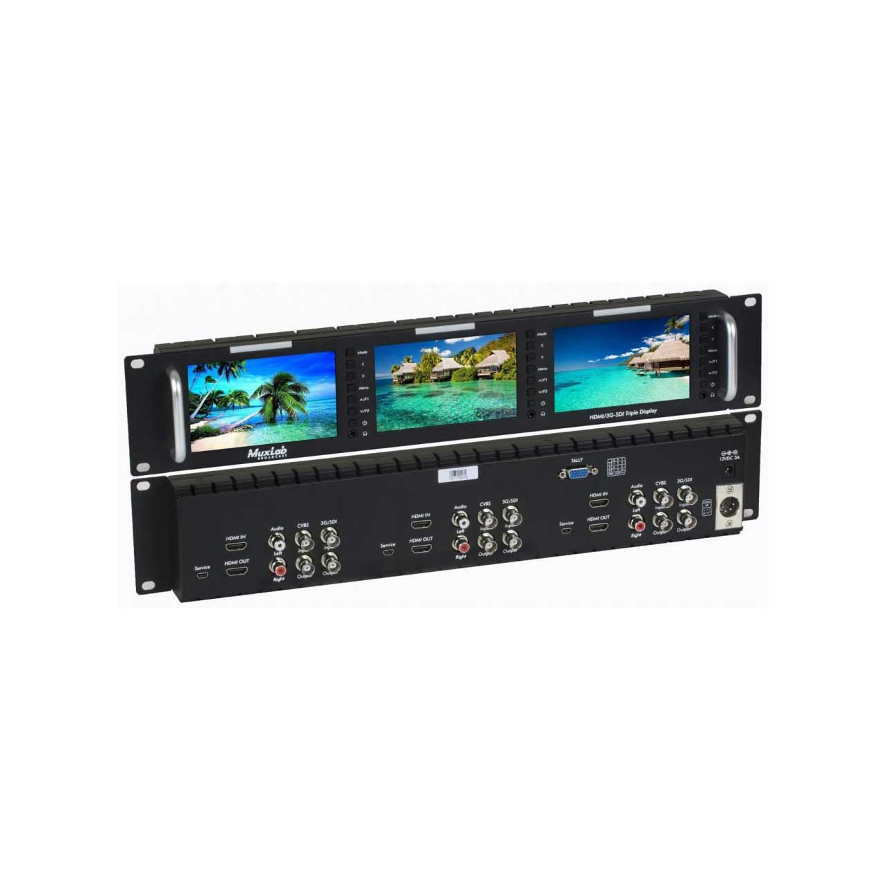 The MuxLab 500840 HDMI/3G-SDI Triple Display supports three independent 5 inch TFT LCD displays mounted conveniently and securely on a 2RU 19" rack. These devices save a significant amount of space in multi-display Pro AV and Broadcast applications.