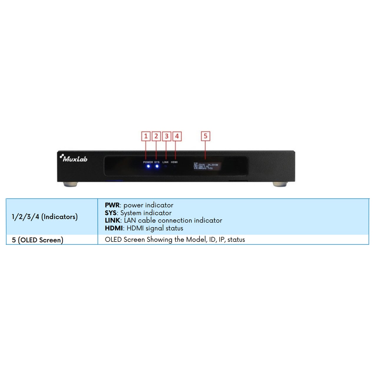 The MuxLab 500860 is a HDMI over IP PoE Seamless Transceiver, 4K/30 allows HDMI source equipment to be extended locally up to 330ft (100m) at up to 4K @ 30Hz resolution via Cat5e/6 cable and is compatible with the MuxLab 500861 Transceivers to support point-to-point, point-to-multipoint and multipoint-to-multipoint configurations, Video Wall and Multiview capabilities in a low bandwidth expandable and cost effective manner, without the need to install dedicated cabling systems. The exceptionally low bandwidth requirements of this device combination allows for streaming audio/video content over a local network, over WiFi, and over the Internet for distributed installations spread throughout the globe. The Transceiver accepts a 4K video @ 30Hz and streams the content to an H.264/H.265 Receiver to be displayed on a 4K monitor. The device supports PoE (PD) and may be powered by a PoE (PSE) Ethernet Switch.