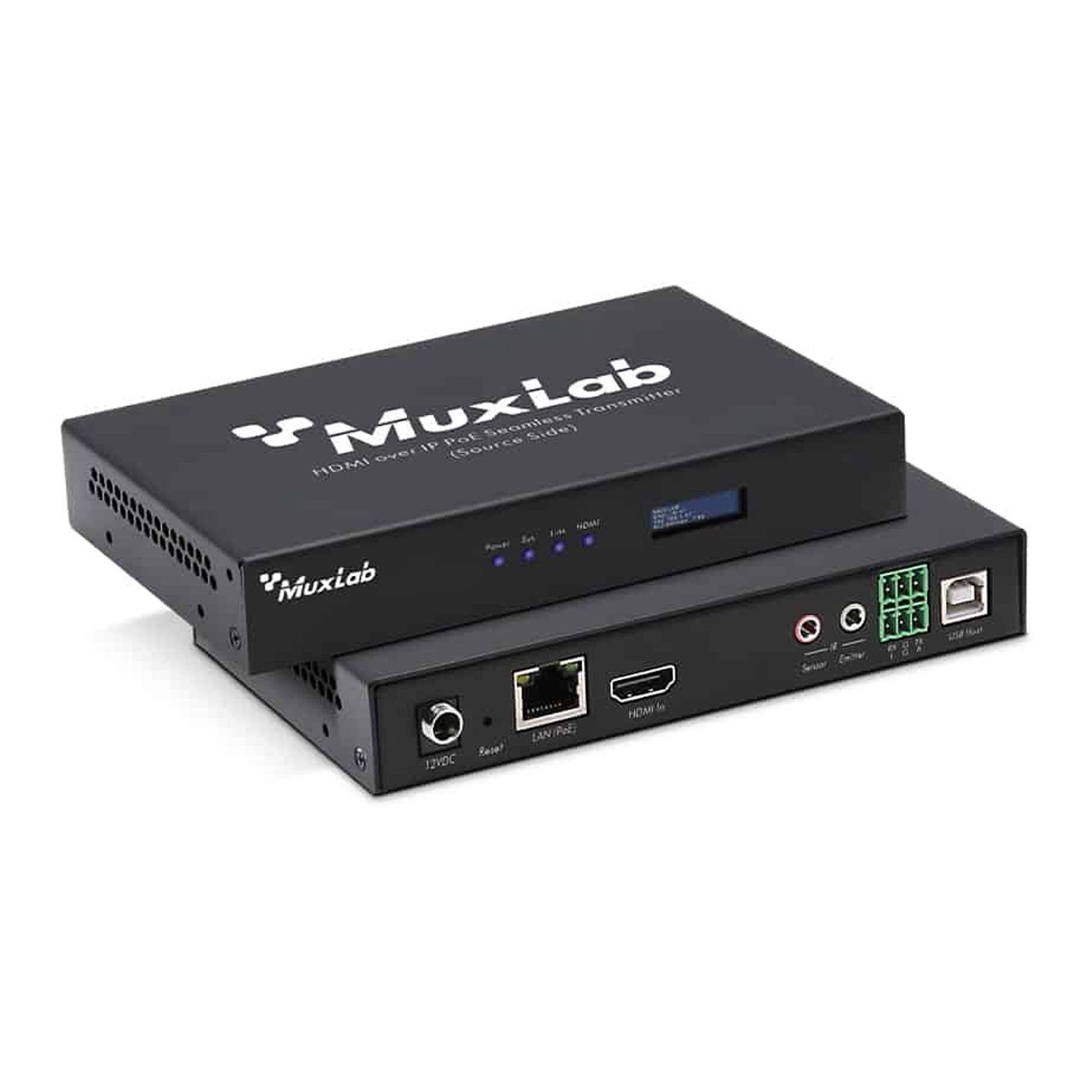 The MuxLab 500864-TX allows HDMI source equipment to be extended locally up to 330ft (100m) at up to 1080p @ 60Hz resolution via Cat5e/6 cable and is compatible with the MuxLab 500864-RX receivers to support point-topoint, point-to-multipoint and multipoint-to-multipoint configurations, Video Wall and Multiview capabilities in a low bandwidth expandable and cost effective manner, without the need to install dedicated cabling systems. The exceptionally low bandwidth requirements of this device combination allows for streaming audio/video content over a local network, over WiFi, and over the Internet for distributed installations spread throughout the globe. The transmitter accepts a 1080P video @ 60Hz and streams the content to an H.264/H.265 receiver to be displayed on a 1080p monitor. The device supports PoE (PD) and may be powered by a PoE (PSE) Ethernet Switch.