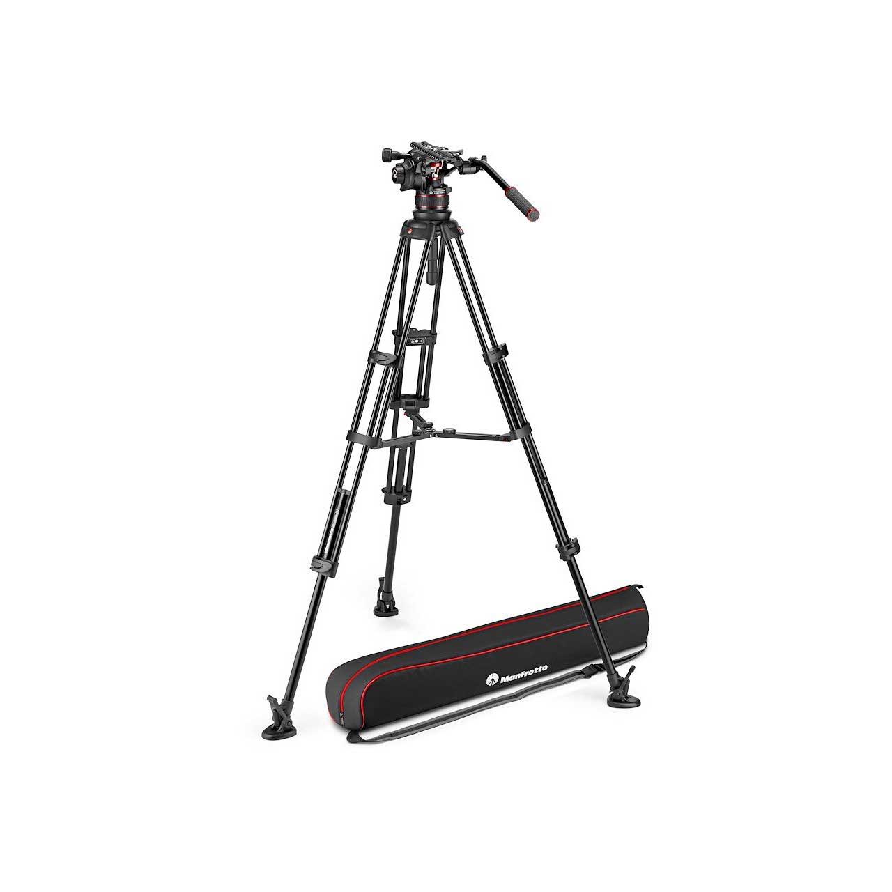 The Manfrotto MVK612TWINMAUS video system includes the NITROTECH 612 fluid video head (flat base) and the MVTTWINMAUS aluminium twin leg with middle spreader tripod.