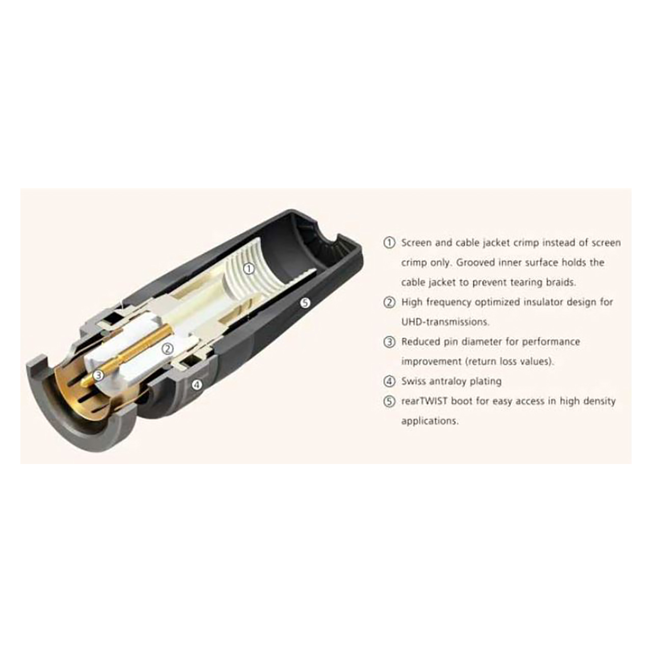 The Neutrik NBNC75BLP9X is a 4K/8K, 12G-SDI, UHD rearTWIST, 75 Ohm BNC Crimp Connector optomized for for Belden 1505A. The rearTWIST UHD BNC connectors are specifically designed for high resolution video signal transmissions. Due to the unique insulator and contact pin design, the connectors feature low return loss values for 4K and 8K signals.