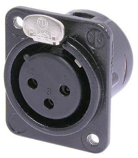 3 pole female receptacle, solder cups, black metal housing, silver contacts, M3 mounting holes. Universal D-size metal body XLR panel mount series. UL recognized component.