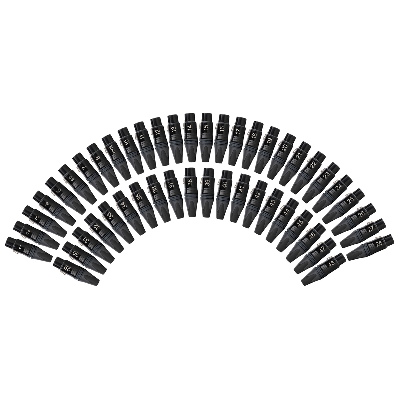 The Sescom NC3FXX-B are customized female Neutrik 3-pin XLR connectors featuring laser-engraved numbering from our in-house manufacturing department. These individually numbered Neutrik connectors provide easy channel identification and cable management. Ideal for live sound, studio use, and any setup that requires clearly labeled and rugged connectors. They're available as singles or in kits.