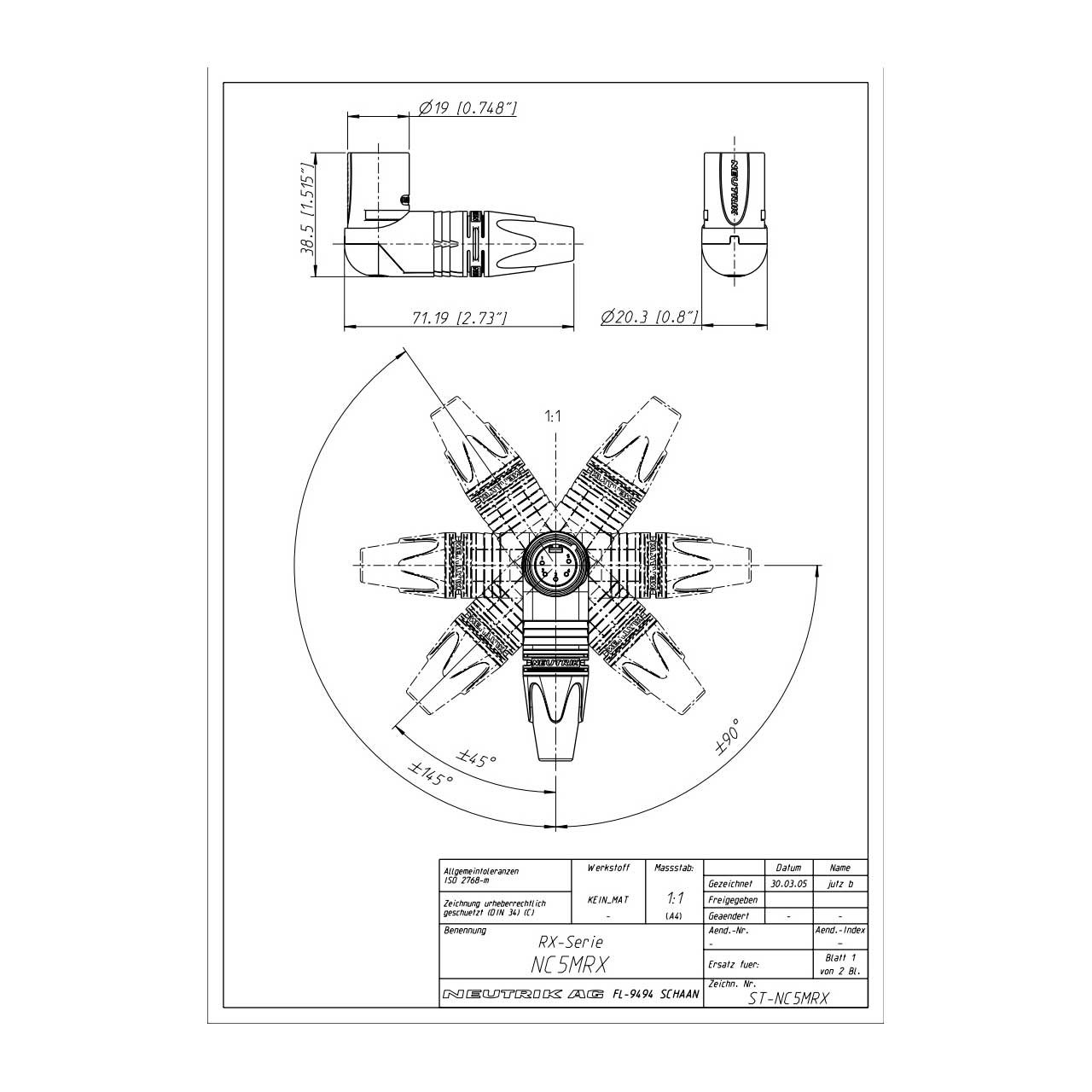 The Neutrik NC5MRX is a 5-pole right angle male XLR cable connector with nickel housing and silver contacts.