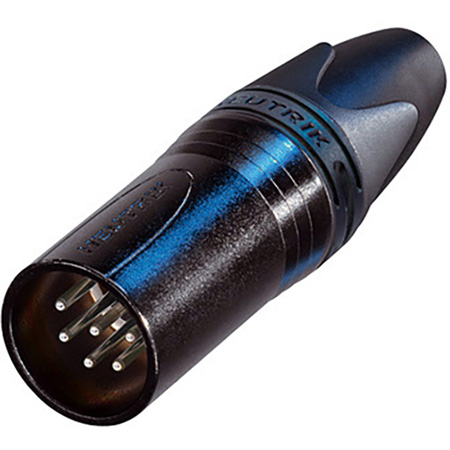 The Neutrik NC6MMX-BAG is a 6-pole male XLR cable connector with black metal housing and silver contacts.