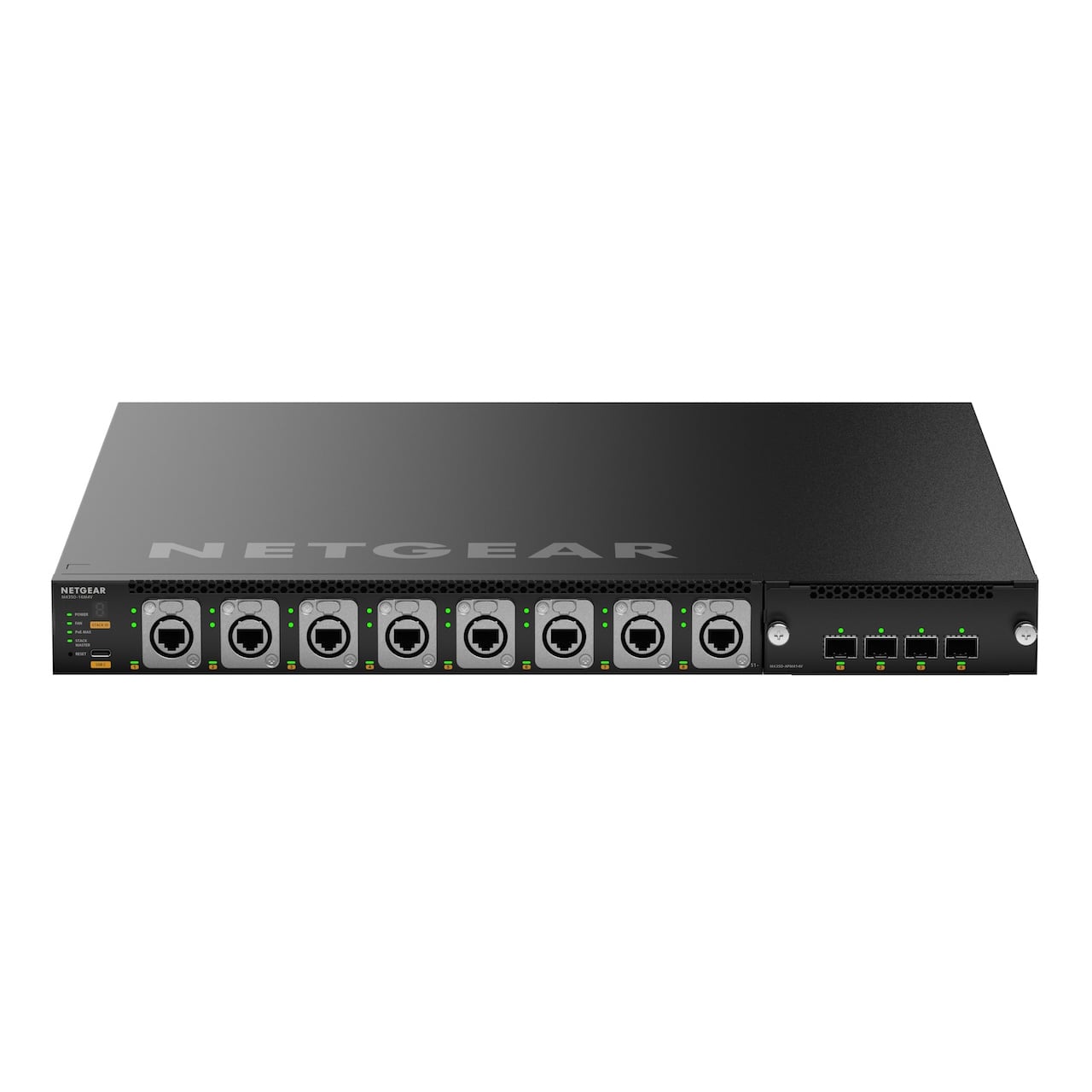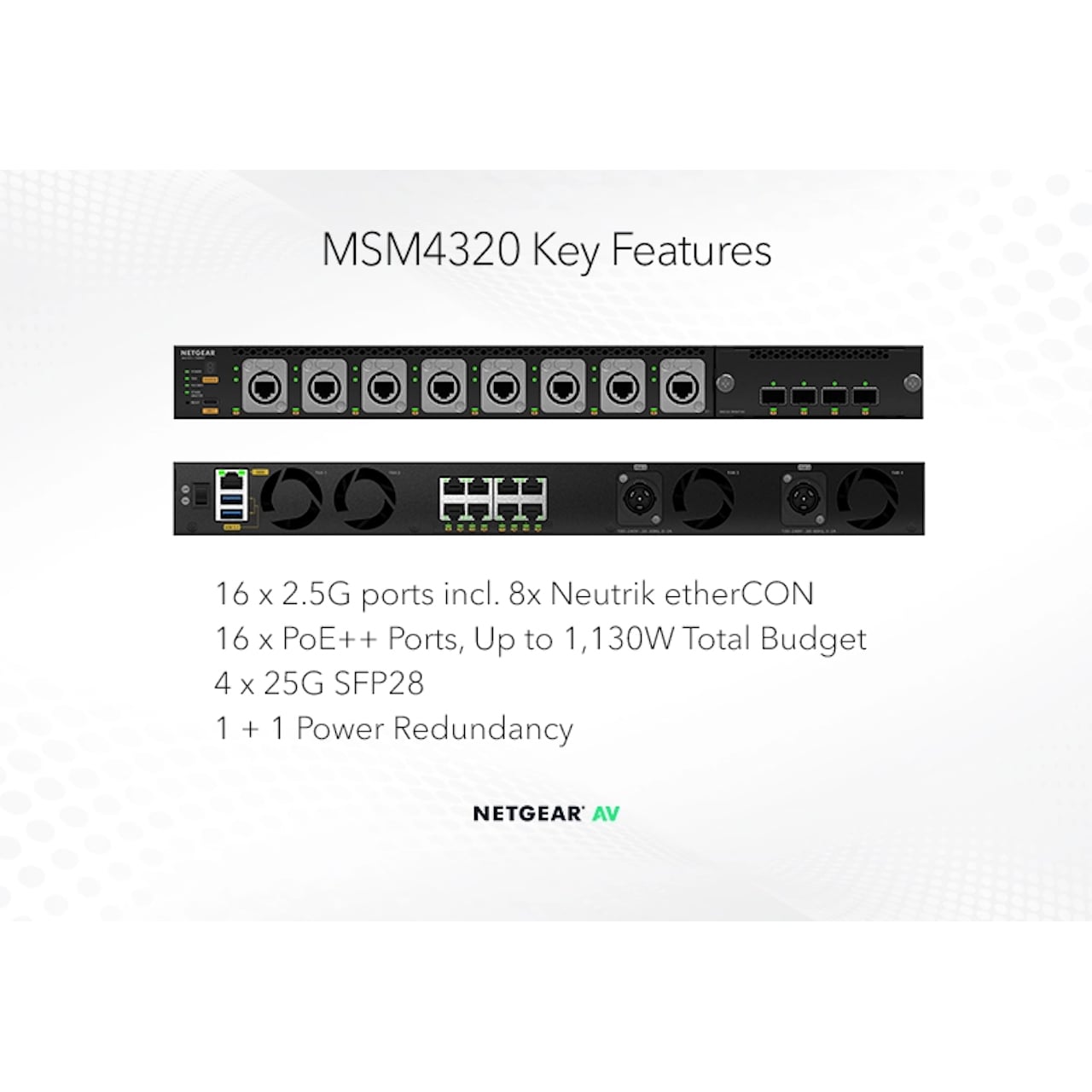 Designed for critical AV over IP installations of up to thousands of endpoints the NETGEAR AV M4350-16M4V brings all the simplicity of the M4250, but now packs in more with NEUTRIK CAT6A etherCON and powerCON TRUE1 connectors + optional interface cards for opticalCON QUAD singlemode or multimode! The revolutionary NETGEAR AV user interface and Engage™ Controller contain pre-configured profiles for all major audio, video, and lighting protocols! Includes two internal 800W power supplies providing 530W of redundant base PoE budget!
