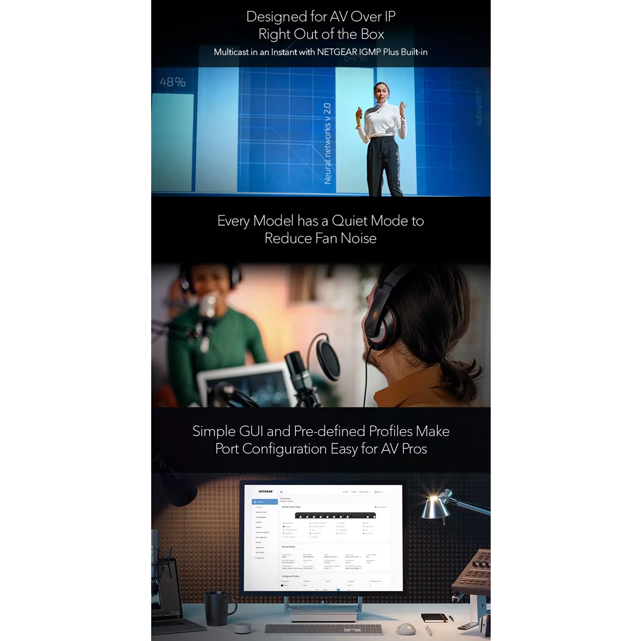 NETGEAR IGMP Plus™ provides multicast functionality right out of the box for most AV over IP applications.