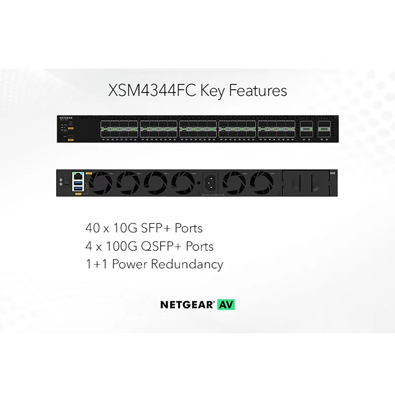 Designed for critical AV over IP installations of up to thousands of endpoints the NETGEAR AV M4350-40X4C brings all the simplicity of the M4250 and packs in more Enterprise-class hardware, a redundant power supply and larger fabric with100G uplinks. The revolutionary NETGEAR AV user interface and Engage™ Controller contain pre-configured profiles for all major audio, video, and lighting protocols!
