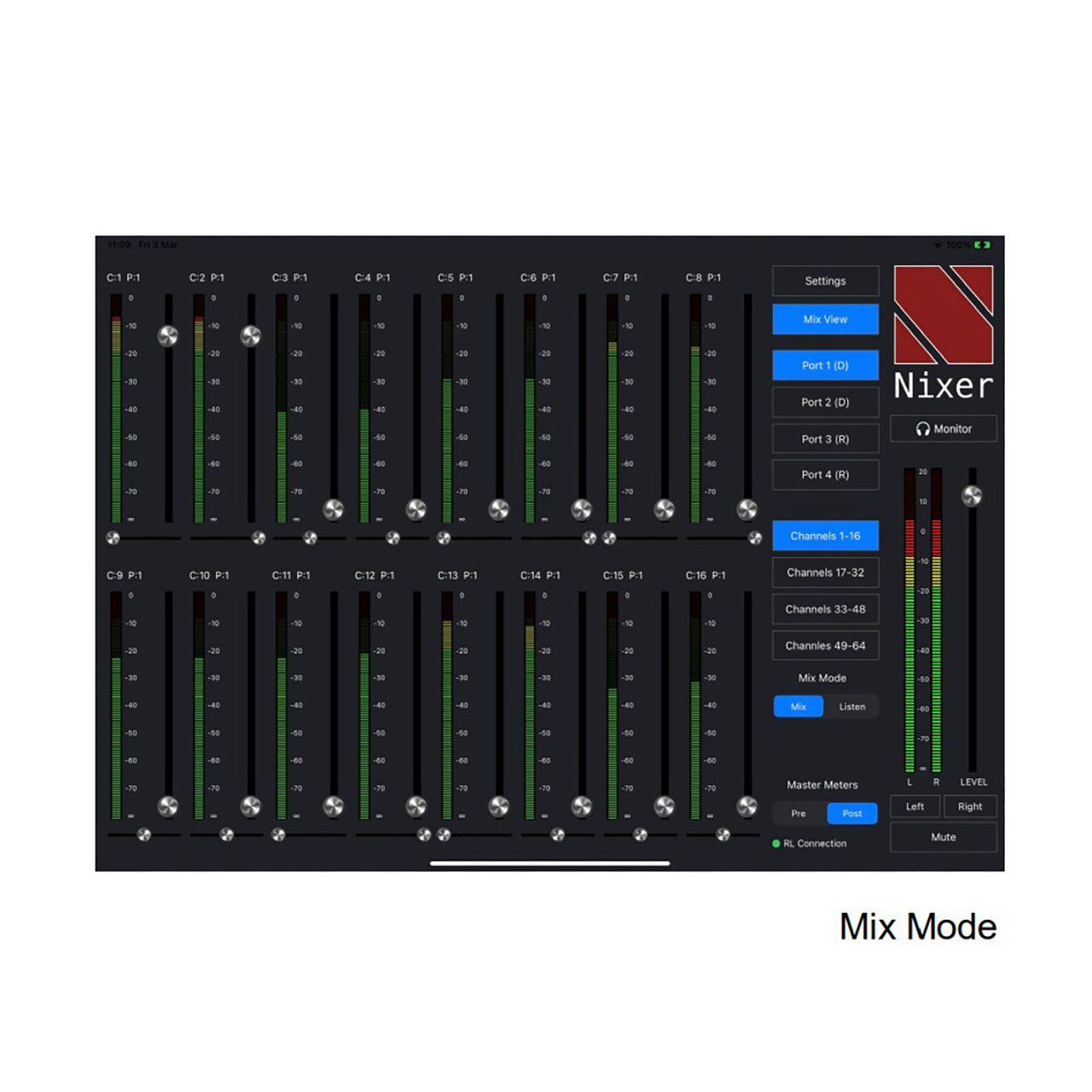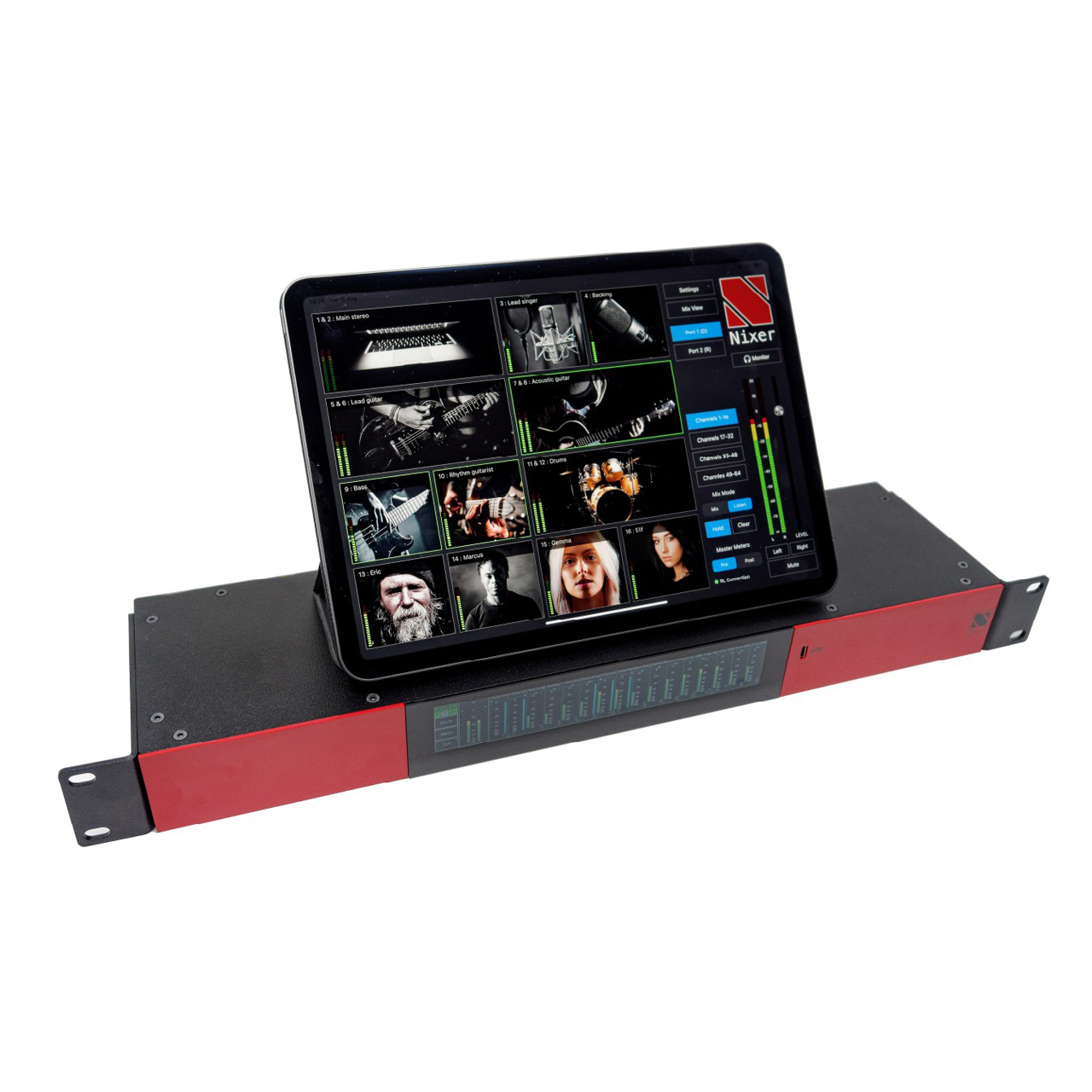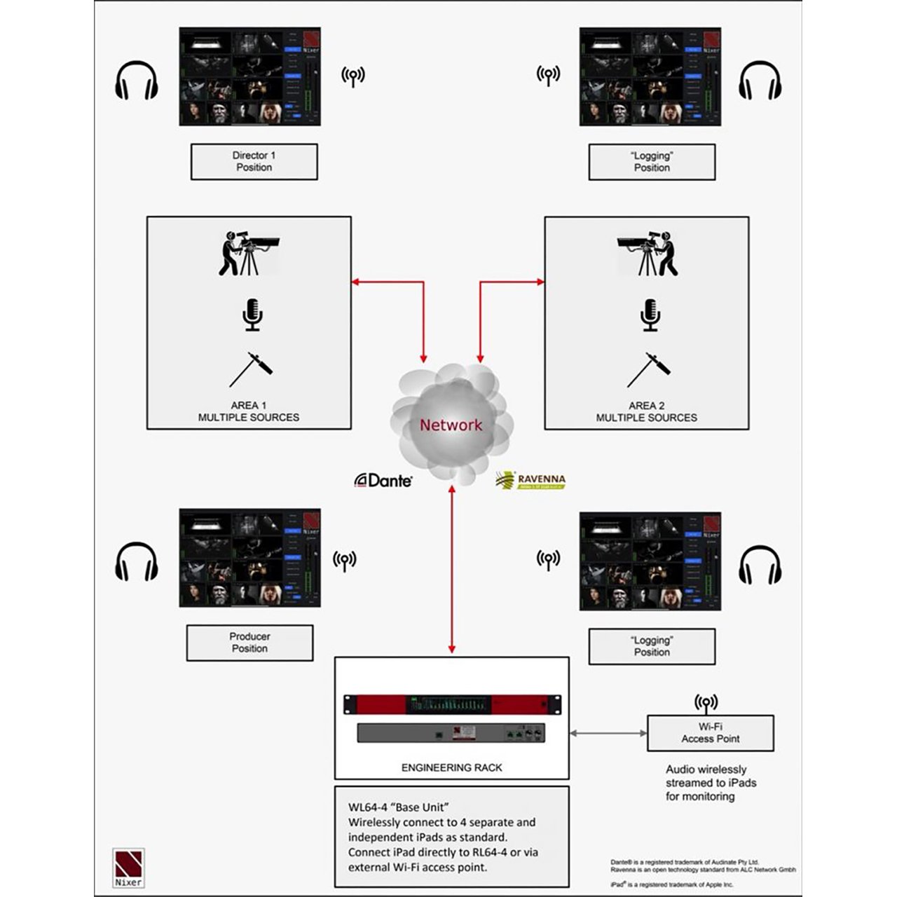 The WL64-4 rack mount Audio over IP (AoIP) audio monitoring unit operates in conjunction with the Nixer Remote iPad App. The WL64-4 provides a "base unit" for the monitoring and mixing of AoIP sources from a Dante or Ravenna network. Each unit is configured at time of purchase to be Dante or Ravenna. The Nixer Remote App allows audio to be wirelessly streamed to an iPad for local monitoring, freeing the Operator from a dedicated hardware front panel display and equipment rack. As standard, each WL64-4 can have four iPads connected wirelessly and each Operator can select and listen to sources independently as well as creating their own individual mixes. Each iPad is able to stream audio wirelessly to the internal speakers, headphone output or via Bluetooth. The audio can be selected in a simple "Listen" or "Mix" mode.