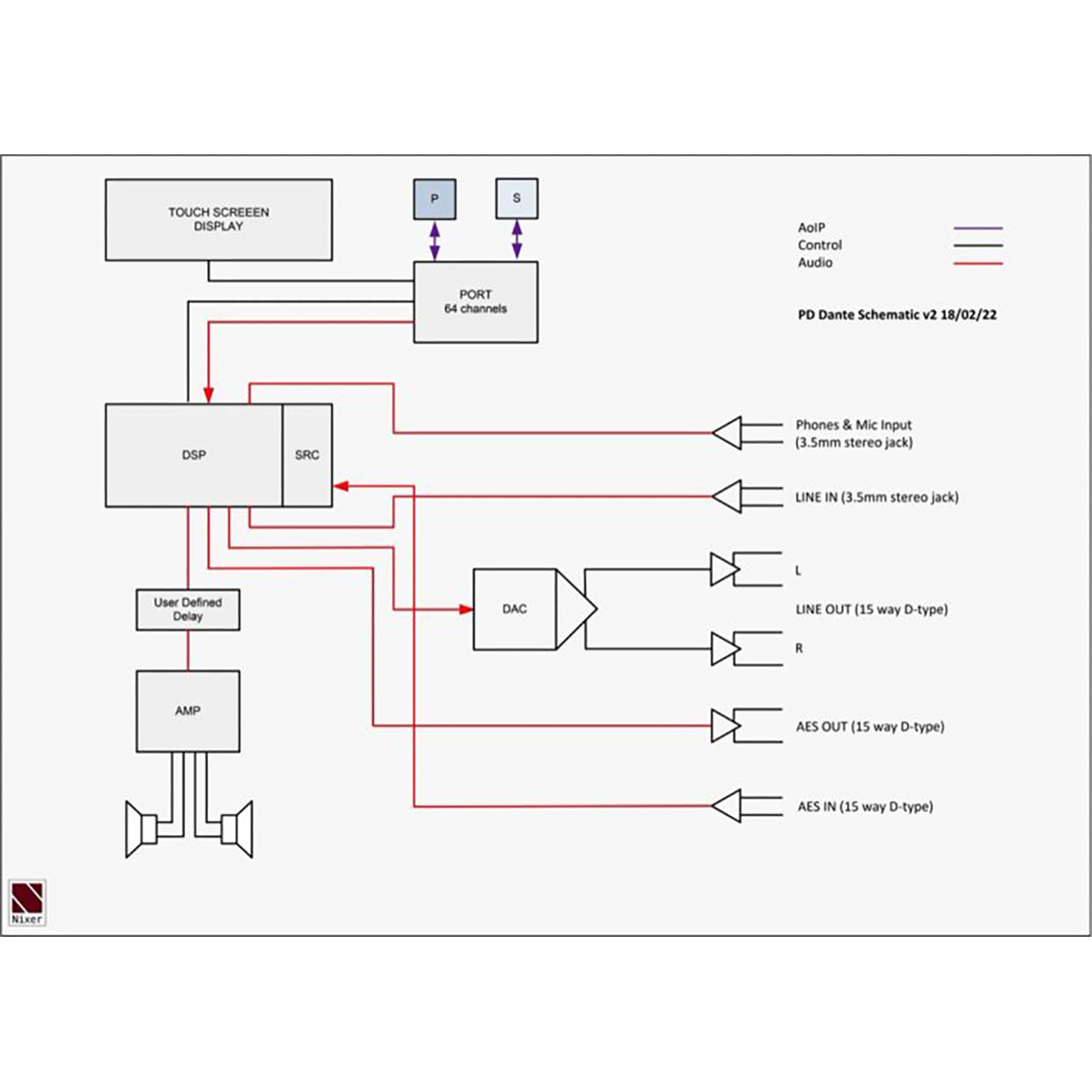 The Nixer PDDANTE small portable Dante unit, which allows the monitoring of up to 64 Dante channels at 48kHz (32 channels at 96kHz). The signals are presented to the user via the inbuilt speakers or the headphone jack. The speakers are automatically muted when a headphone jack is inserted. Simultaneous outputs are also available in the form of the stereo balanced line outputs and AES output accessed via the 15way D-type.