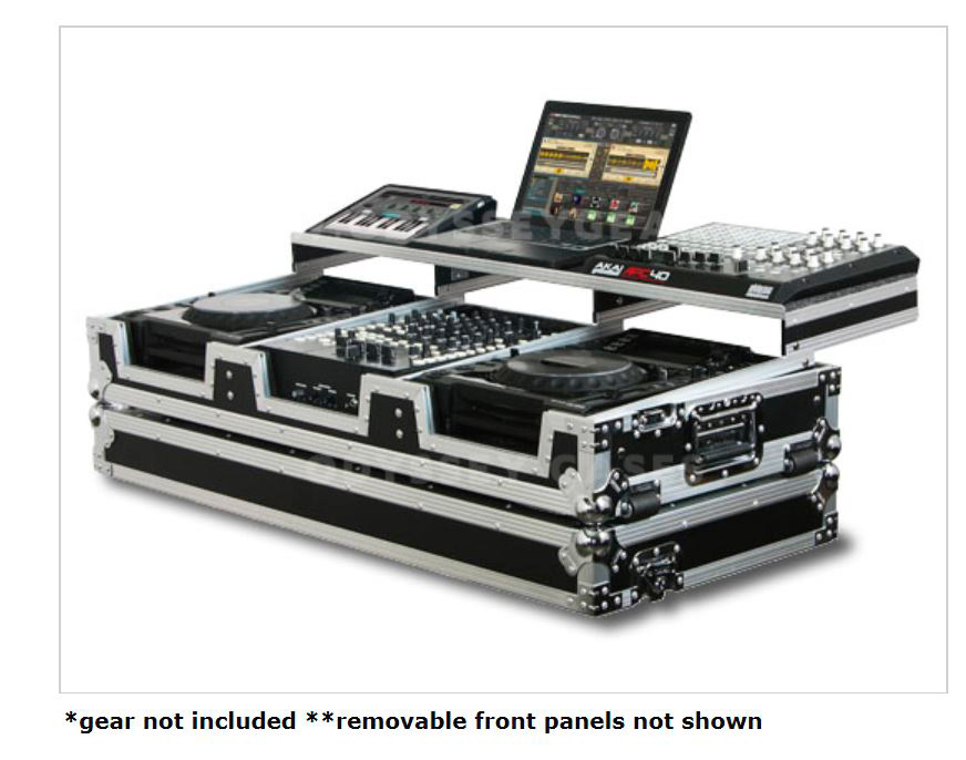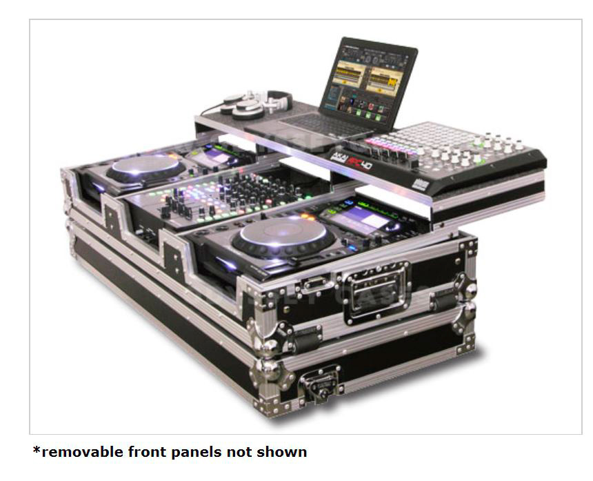 Our Glide Style Coffins features our patented Laptop platforms that glide forward and backward over the mixer and players. This model holds two large format tabletop CD/digital media players, one 10" width mixer, and enough platform space for your laptop, interface, hard drive, midi controllers and other DJ Remixer essentials. Other features include player/mixer ventilation pits that can also be used as storage compartments, rugged built-in corner roller wheels, heavy-duty spring loaded latches, stacking ball corners, and removable V-Cut front access panels. Cabling is clean and easy through convenient access ports throughout.